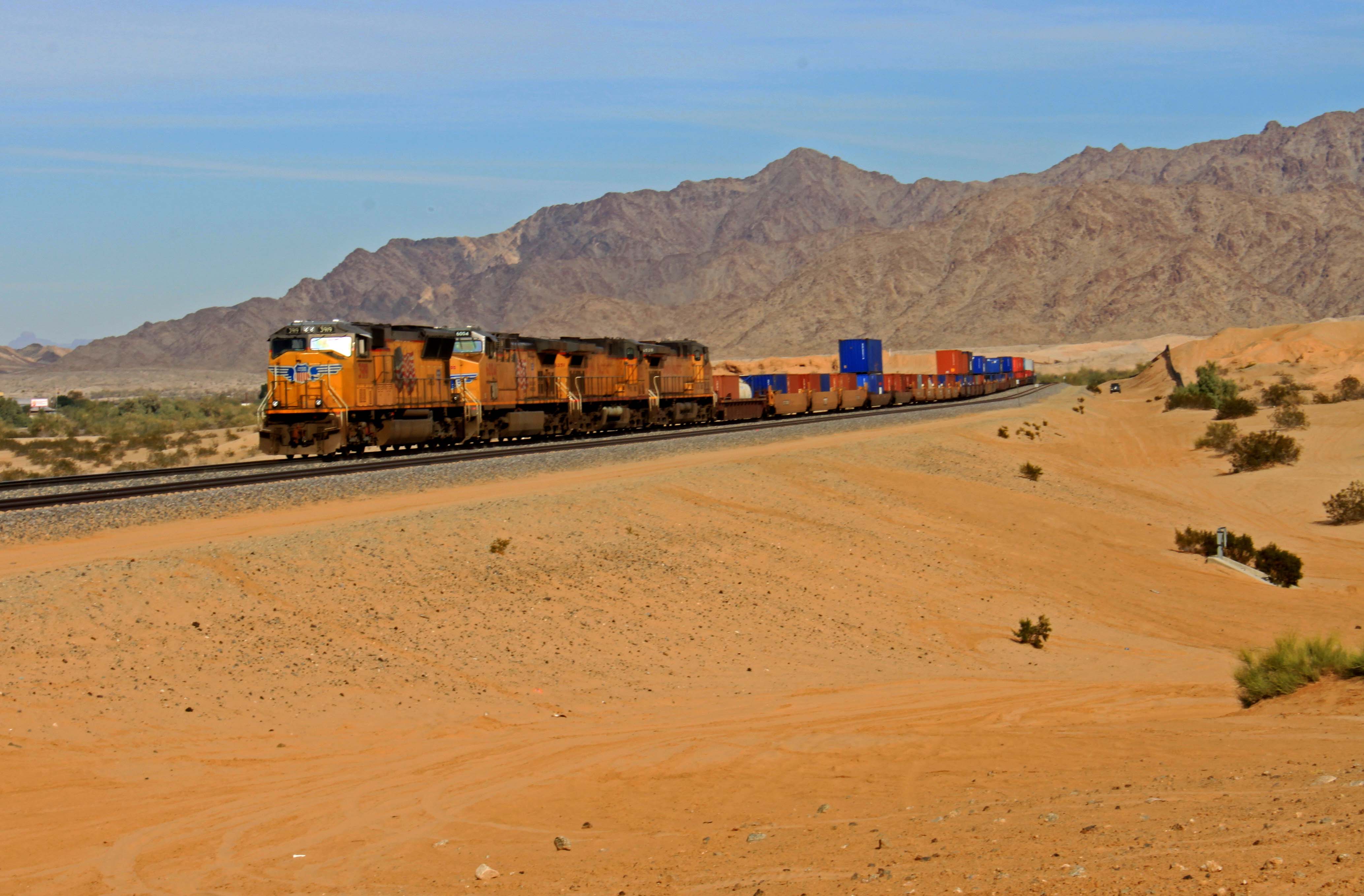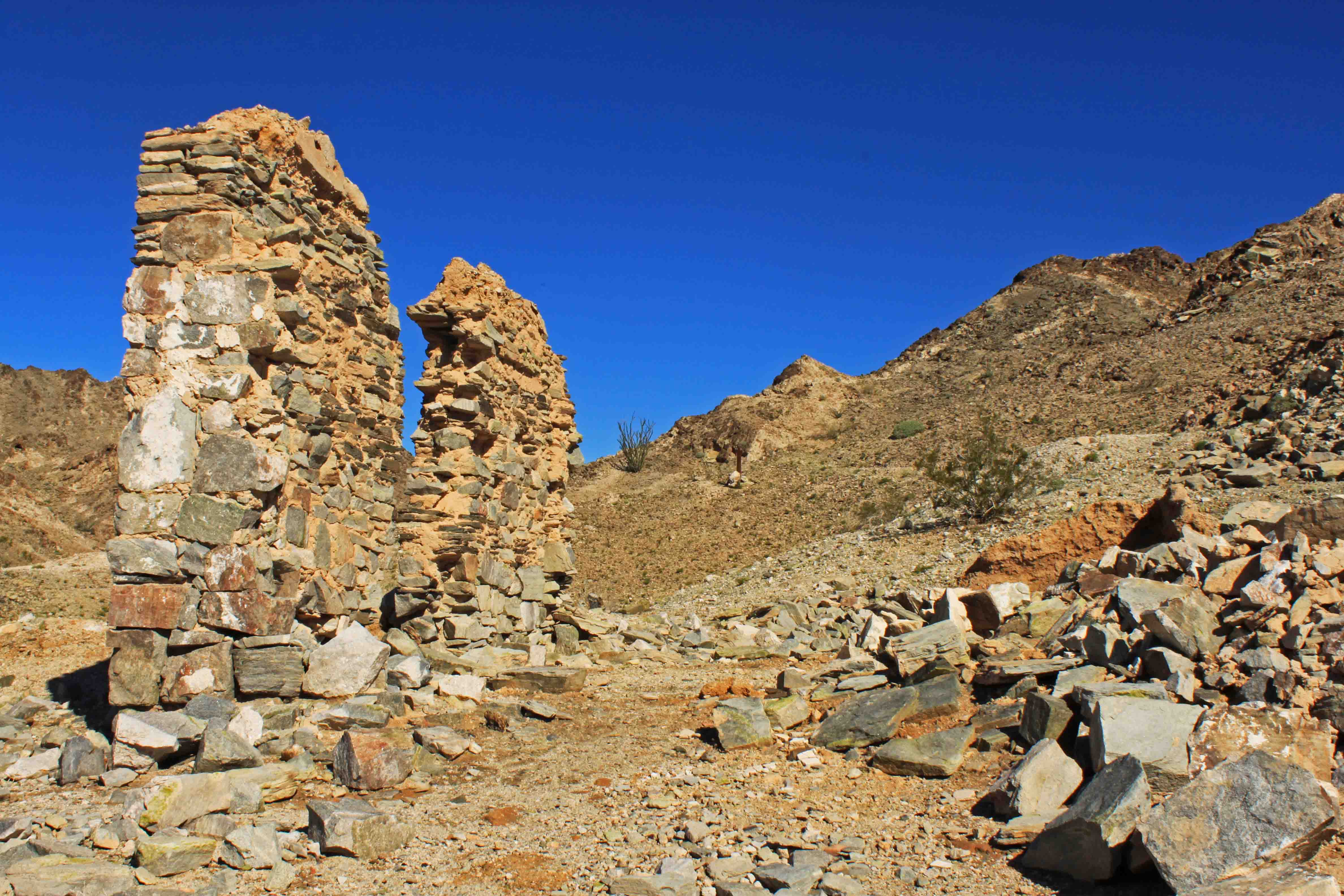 We stayed off Ogilby Rd North of I-8, 15 miles west of Yuma AZ. The site we picked was a short drive down Sidewinder Rd where we could park and watch trains on the Sunset Route of the Union Pacific RR. There was a grade crossing about a mile away so we were serenaded by train horns day and night. Not too loud, just comforting. A short drive from our site was the ghost town of Hedges or Tumco. It was a briefly succesfull town around the beginning of the 20th century. Today the remains of the town are protected by the BLM and a great place to hike.