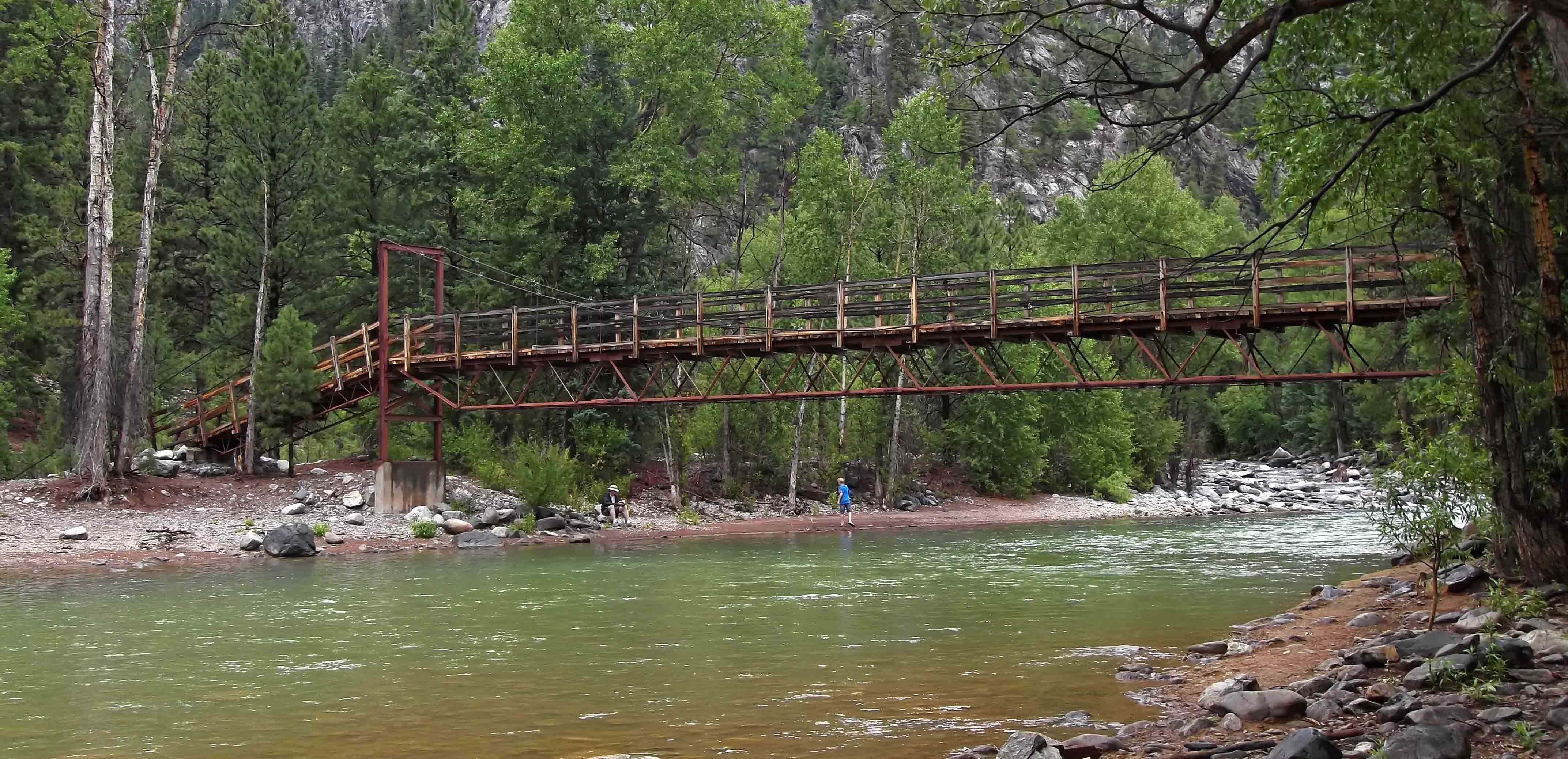 By the time we reached the river our overall descent was about 1100 feet. We crossed the Animas on a beautiful wood deck suspension foot bridge. This lead us to the Durango and Silverton RR pavilion where we waited out the rain. After exploring the area up and down the river we flagged down the steam train headed back to Durango. Unfortunately the engineer failed to stop for 4 people flagging him down. He simply shouted over the din of the screaming locomotive “Catch the next train!”. Well, we knew the 4PM train was the only train allowed to stop but we were hopeful. Sure enough the 4:30 train did stop to pick us up. We all enjoyed the spectacular scenery of the rail route through Animas Gorge and arrived back in Durango.