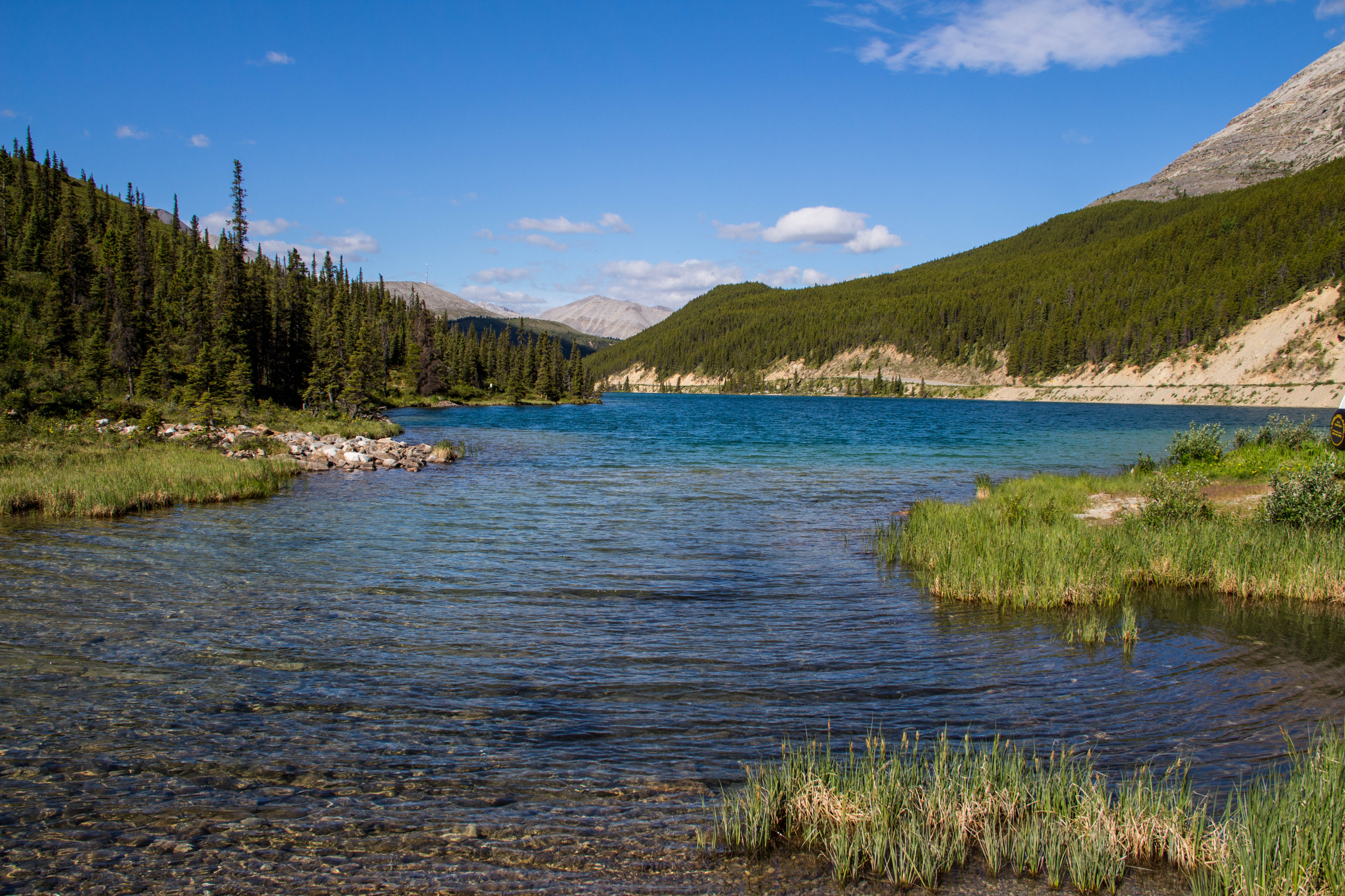Just down the road from Stone Mountain we drove by Muncho Lake with its 3 campgrounds and more beautiful views.  Then we arrived at Liard Hot Springs Provincial Park.  The hot springs have been popular for thousands of years.  BC Parks has created a comfortable yet rustic experience for visitors.  The hot pool is around 125 degrees and the next pool around 103.  The pools are surrounded by vegetation with a sandy bottom.  Amazingly one can find cooler water just by walking a few yards downstream.  The hot pool is extreme and only a few use it but the rest is popular with everyone.  The campground at Liard is very nice with well separated sites and lots of big trees.   Its only a short walk to the pools.