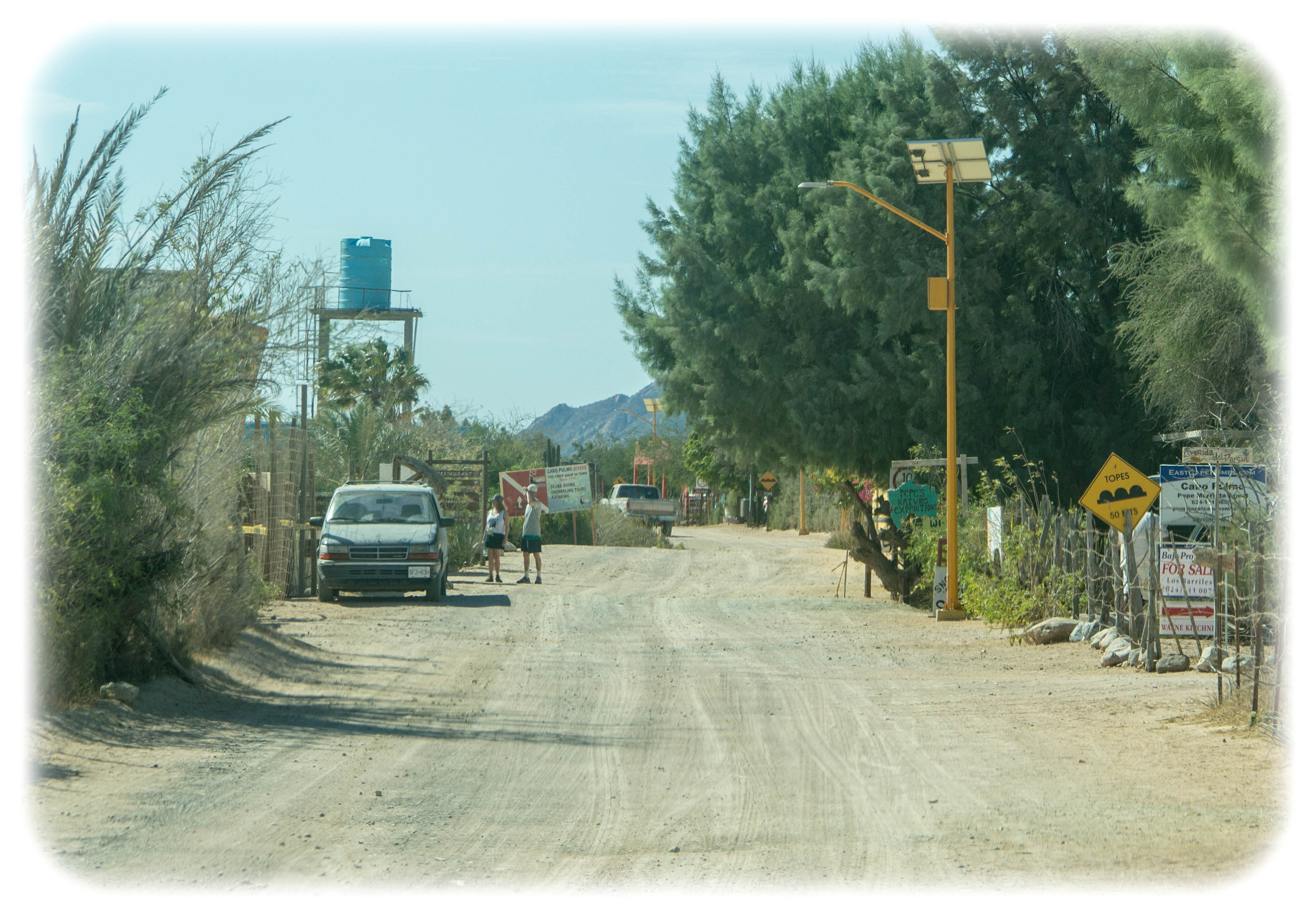 While we loved the relaxation of the beach we also ventured off in various directions in our tow car to explore southern Baja. We visited our friends Grant and Arabelle at Cabo Pulmo. Right at the Tropic of Cancer, Cabo Pulmo is home to a large Marine National Park and a very accessible coral reef. The town itself is on a very dusty washboard dirt road and has only solar power for electricity but very picturesque.