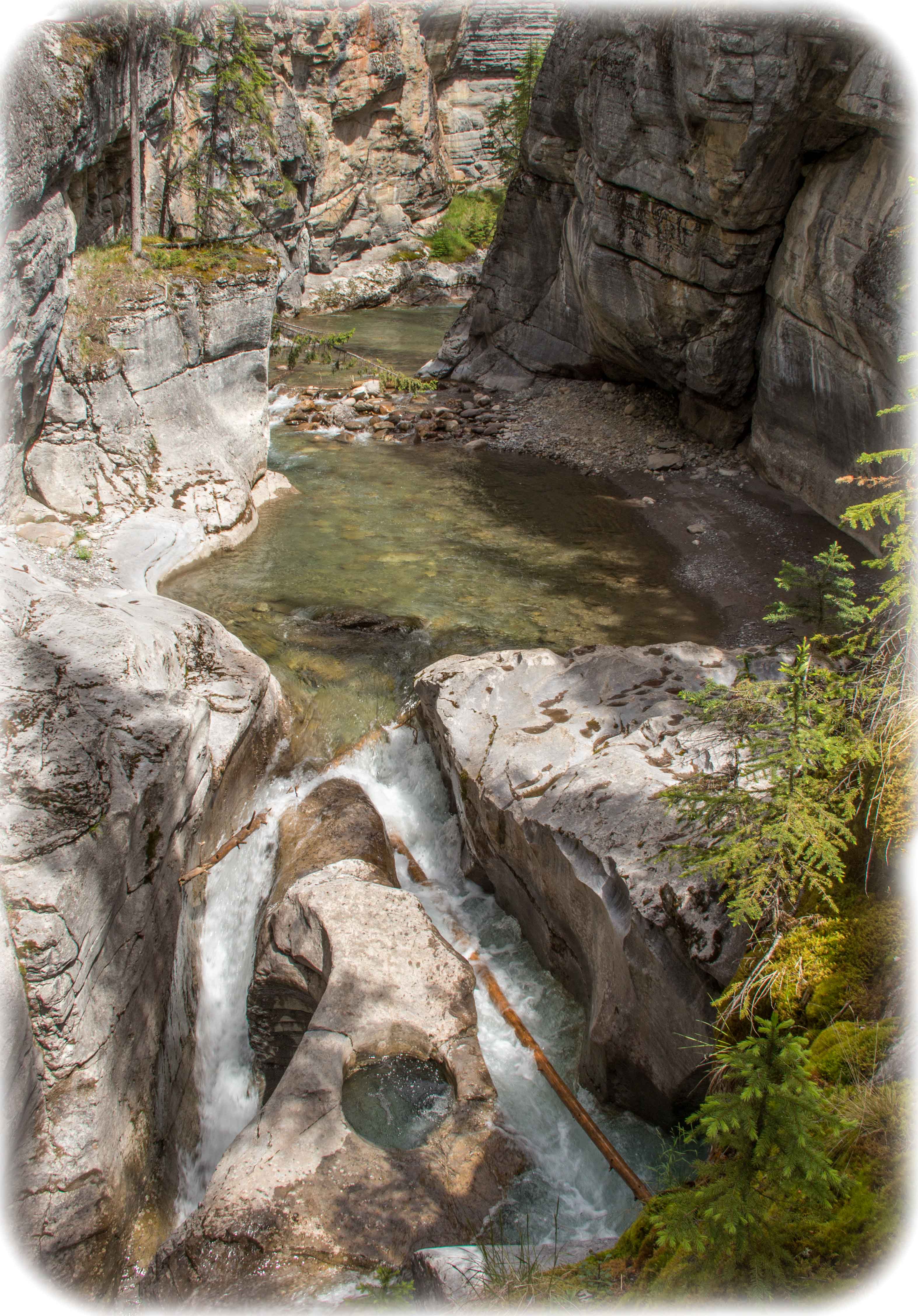 Our last full day in Jasper we went to an abandoned homestead of original Metis settlers in the area. What a beautiful valley they lived in. Establishment of the park forced all residents to leave. The homestead in the only remaining sign of these early pioneers. Later that day we took a soak in the Miette Hot Springs. The warmest in the Rockies, it comes out of the ground at 54C and must be cooled for humans. There is a very hot pool (40C), a hot pool, a cool pool and a cold (10C) pool. We soaked in the 2 warm ones and dipped our feet in the cold. Another interesting feature of the area is the trail to the source of the springs which includes a visit to the old hot springs structure abandoned in the 80s. Imagine an archeological hike to a site from the 80s?