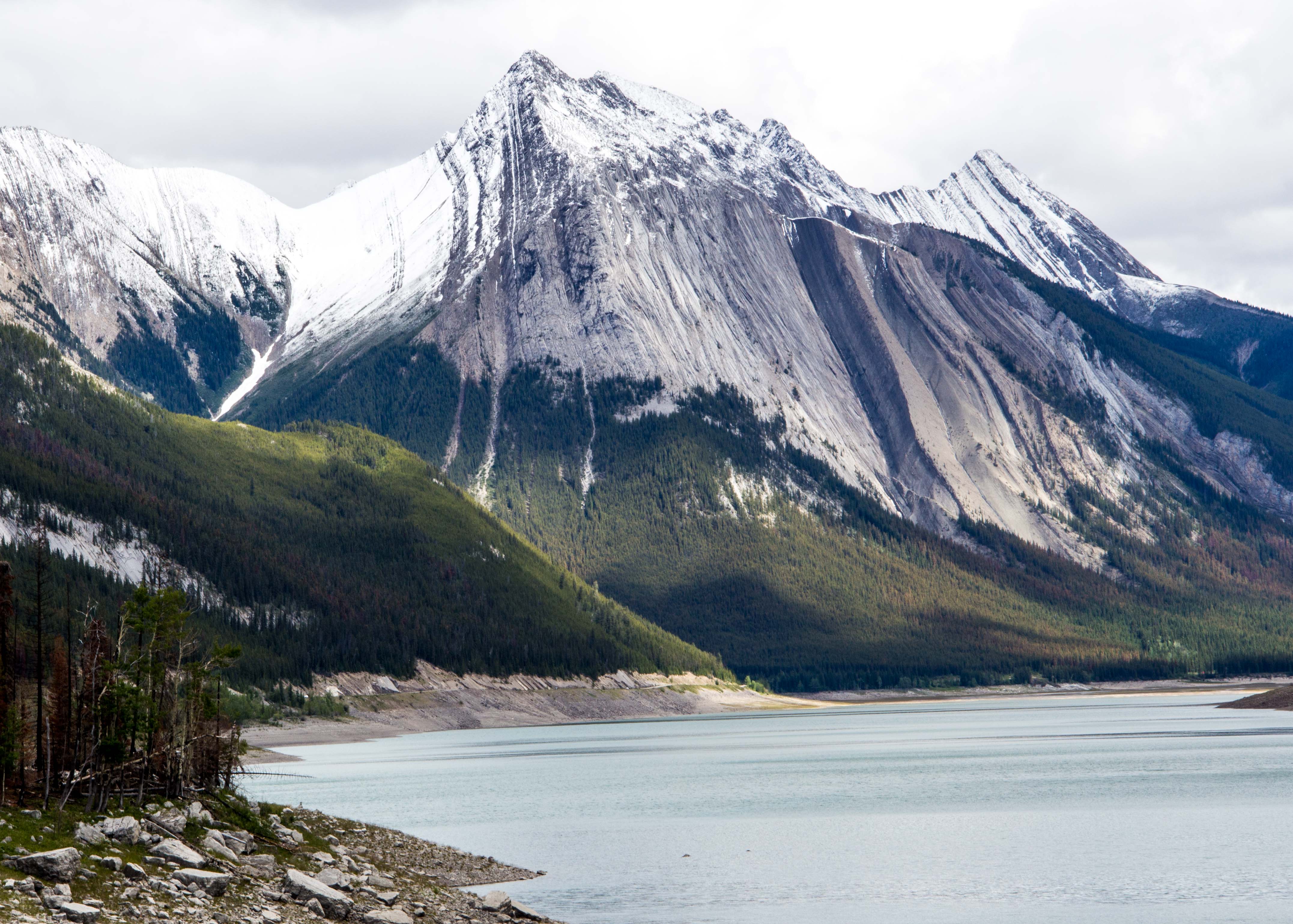 Our Canadian Rockies tour continued from Banff up the Icefields Parkway to Jasper National Park. The parkway way was beautiful although our visibility was limited due to low clouds and blowing snow! Yes, in late June we had snow flurries off and on. At the famous Icefield Centre we had 41 degrees F and fierce winds blowing snow. We saw many glaciers but it was too severe for these Florida folks to walk the glacier.