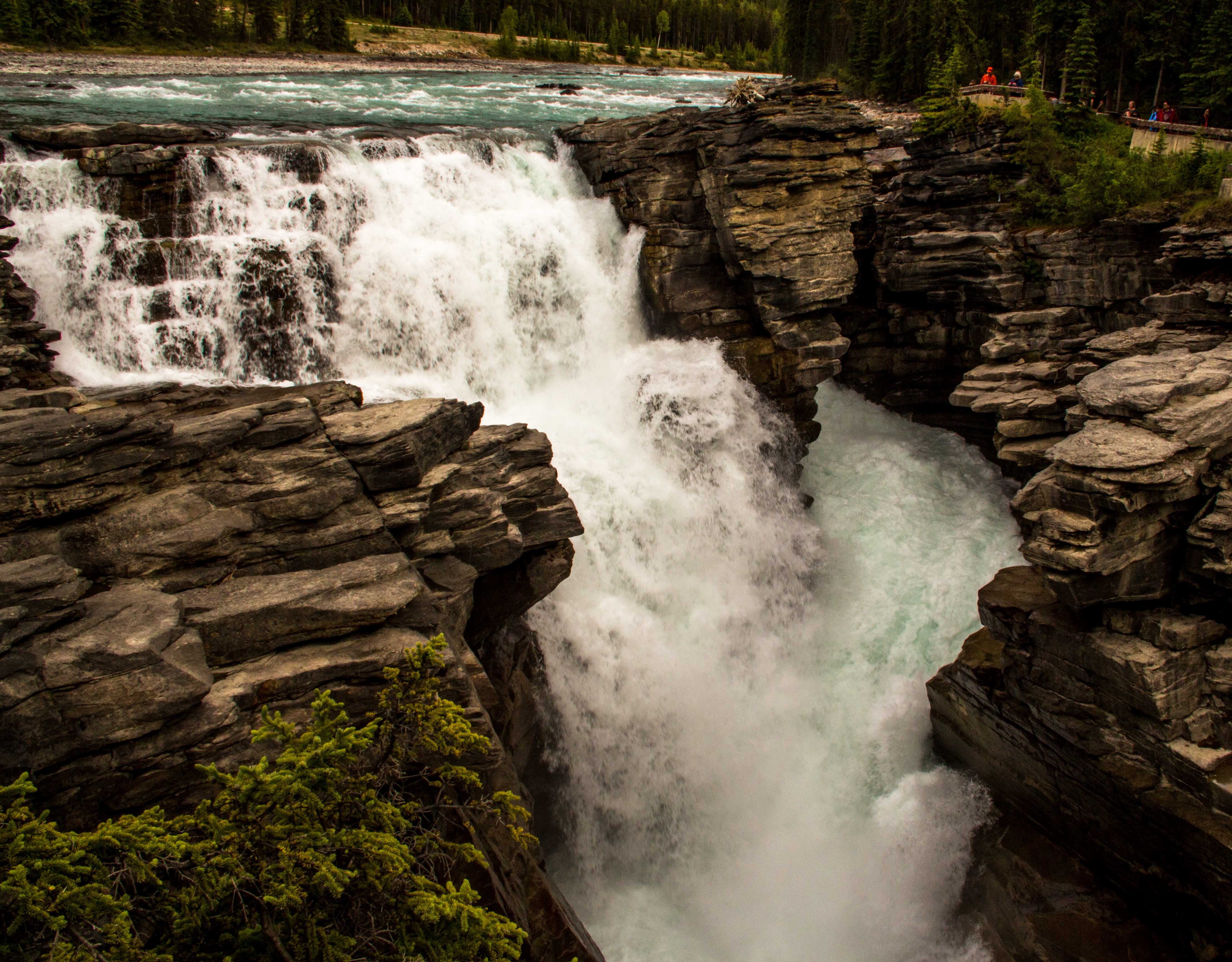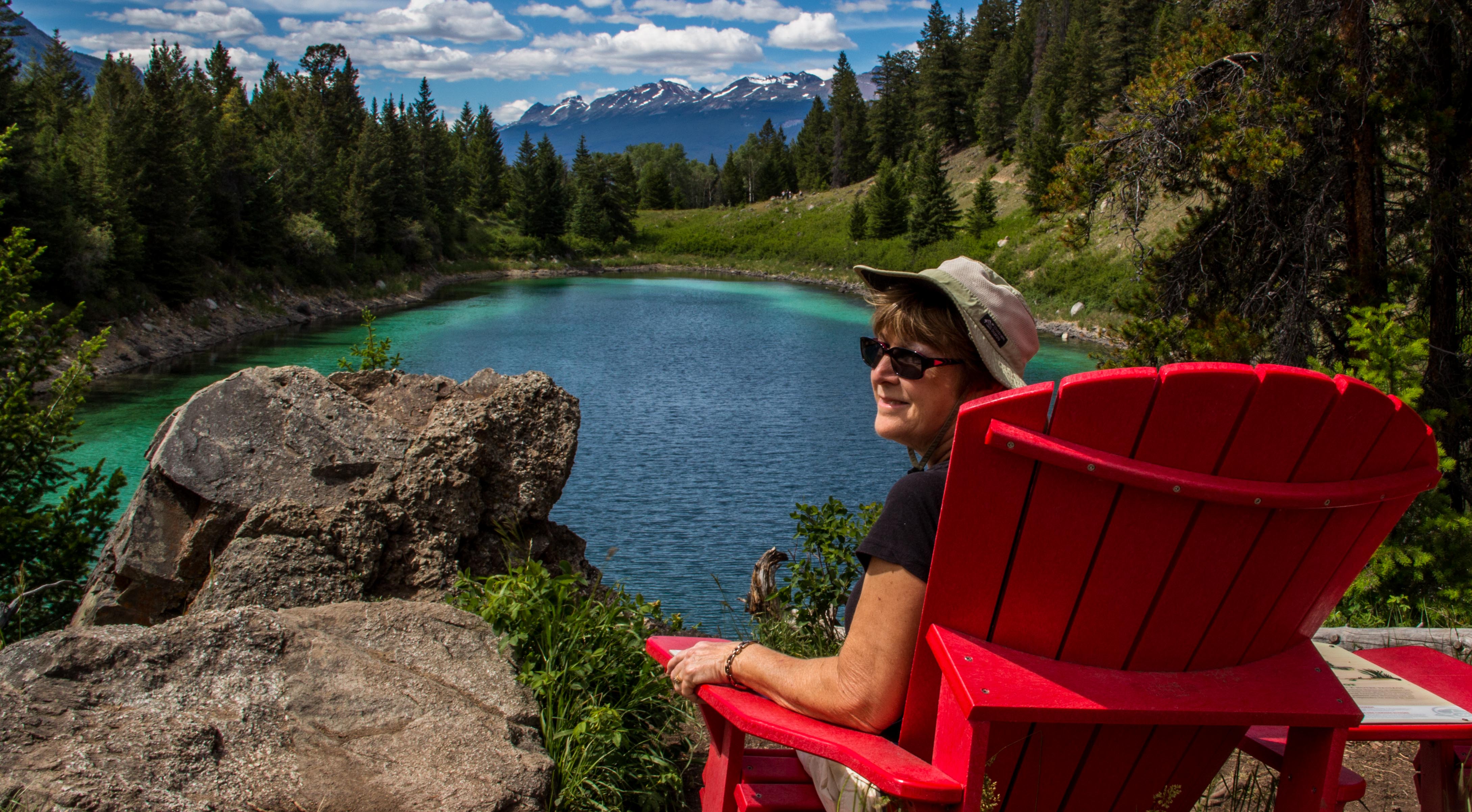 Another adventure in Jasper was our hike to The Valley of the Five Lakes. This was a well used trail system of about 5 miles around five small to medium sized lakes. It was a vigorous hike highlighted by 2 more of the red chairs and more bears. First we saw a bear approach one lake for a drink, then swim quickly across the lake. Then we saw 2 huge black bears near our trail causing us to chose a different route. We met nice people along the way and hiked together to form a larger group. Later that day we visited Athabasca Falls, a powerful falls on the glacier fed river. The next day we joined a raft trip from the falls down the river through a canyon toward Jasper town. The water was cold (39F) and milky from the glacial flour but perfectly clean to drink. Later in the trip we had cold driving rain in our faces. Good thing we wore wet suits. Summer in the Rockies!