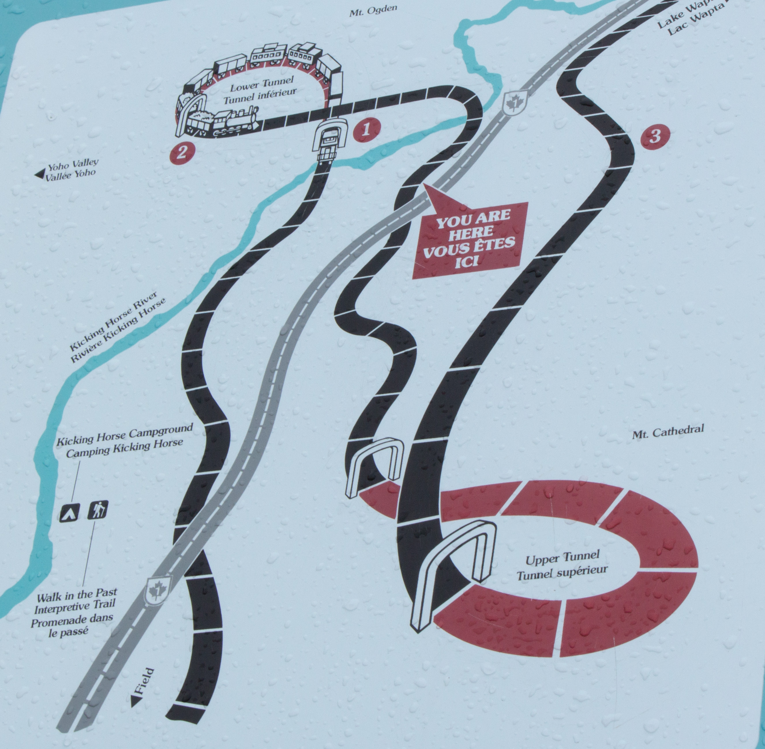 Yoho National Park is home to the CP’s famous spiral tunnels.  When the transcontinental railroad was first built it included a 4.5% grade on the west side of Kicking Horse pass. This was twice the safe grade permitted by the Canadian government and terrified trainmen as well as passengers.  Though no loss of life was reported the railroad rebuilt the line using spiral tunnels to lengthen the mileage of the grade and reduce the incline.  The two tunnels enter the mountains then spiral back at a higher level so trains literally cross over themselves climbing the pass.  It is a big attraction for visitors to the park and a thrill for railfans.