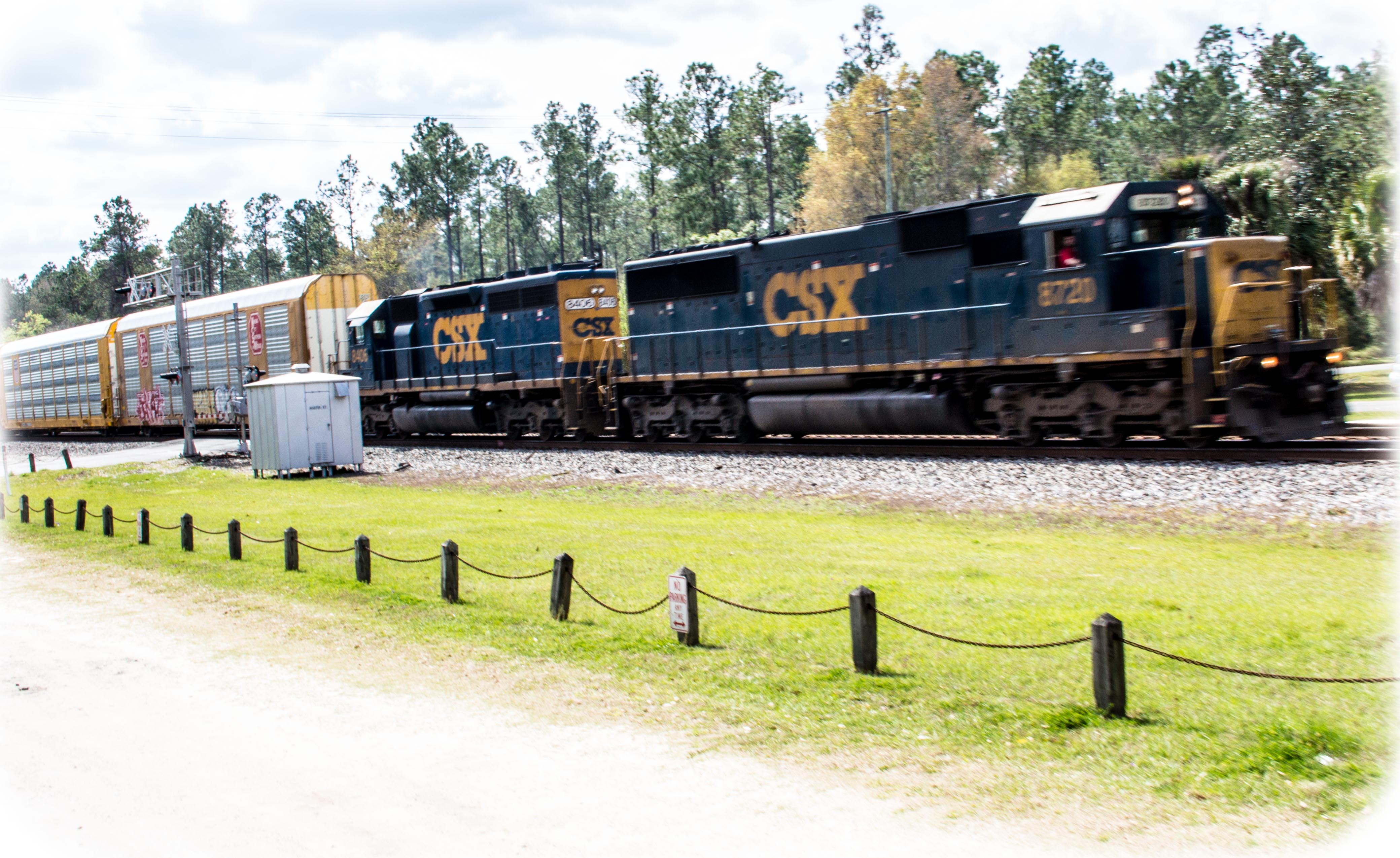 Folkston Georgia is just across the stateline from Florida and has long been a favorite train watching sight. We have been visiting whenever in the area for over 15 years and the town keeps improving the experience for railfans. Our visit this time was especially enjoyable as we met a great many super nice people including some young men from North Carolina who were so knowledgeable and enthusiastic about CSX. Folkston is known as “The Folkston Funnel” since CSX mainlines from several areas converge to funnel nearly all traffic past the Okeefenokee Swamp into Florida. The boys counted 60 trains in their first 24 hours! We saw the Tropicana Juice train, Amtrak’s AutoTrain (twice) and many many more.