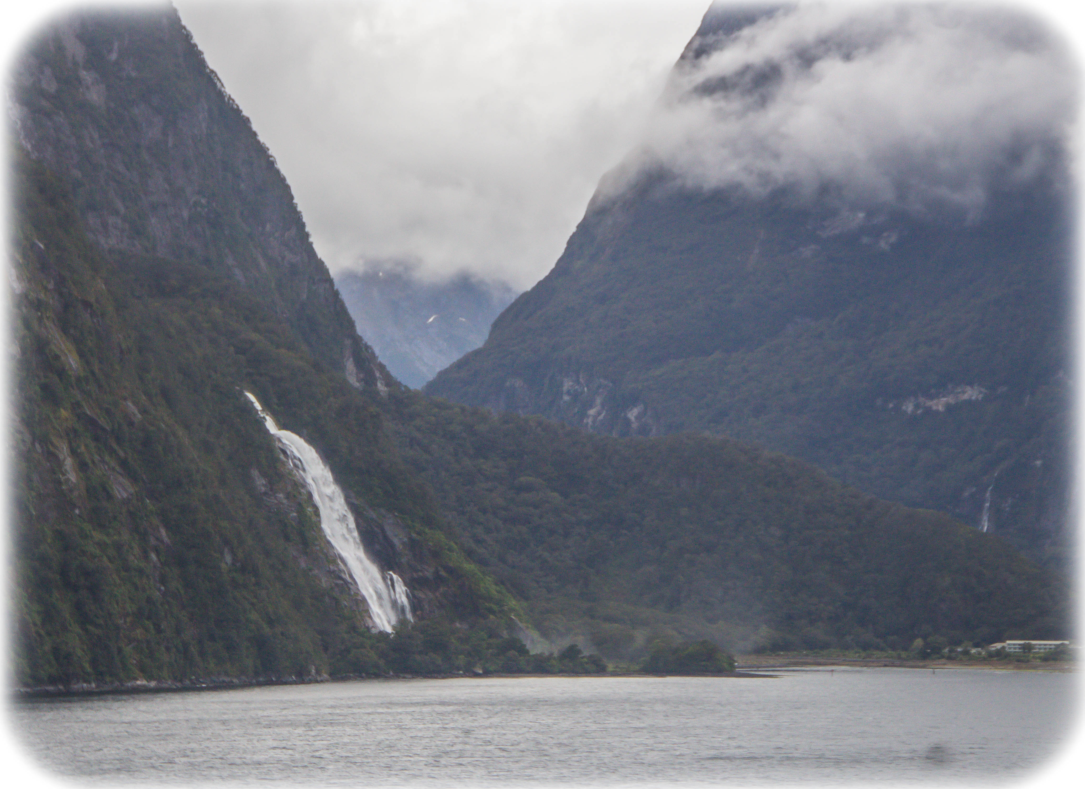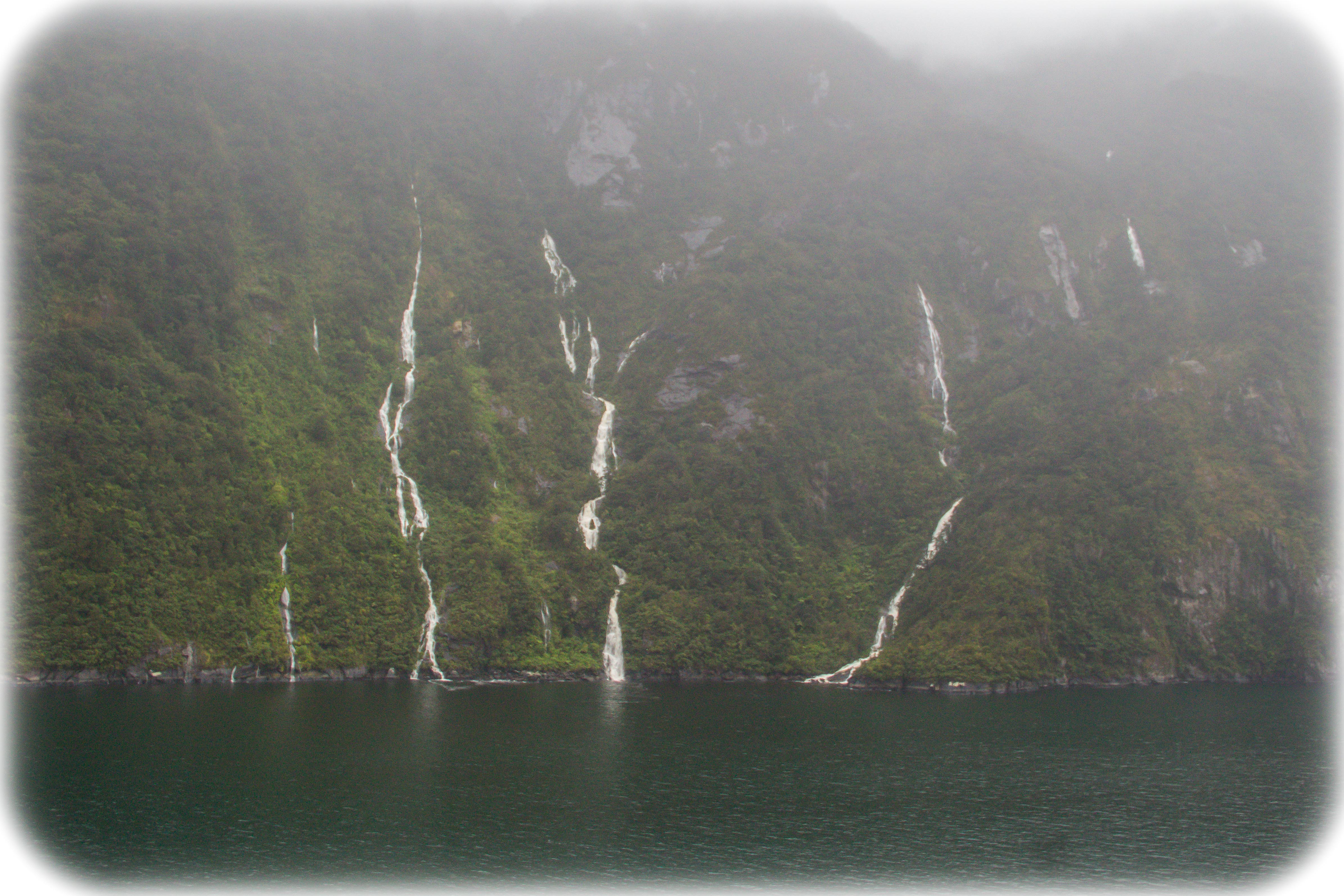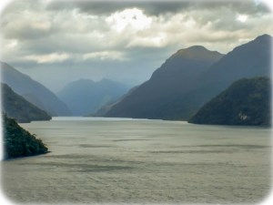 Our first New Zealand stop was not a stop at all but a series of sounds, Milford Sound, Doubtful Sound and Dusky Sound. Milford is really a fjord cutting into the rugged mountains of southwest New Zealand. It was cold and raining as we cruised the sound. Because of the rain we saw countless waterfalls. When it was time to turn around and exit the captain did donuts with the gigantic ship affording great views and cheers from the passengers. Doubtful Sound later the same day gave us better weather so we got some decent photos. Dusky Sound was our last sound transit and as we exited we were at the south end of New Zealand’s South Island.
