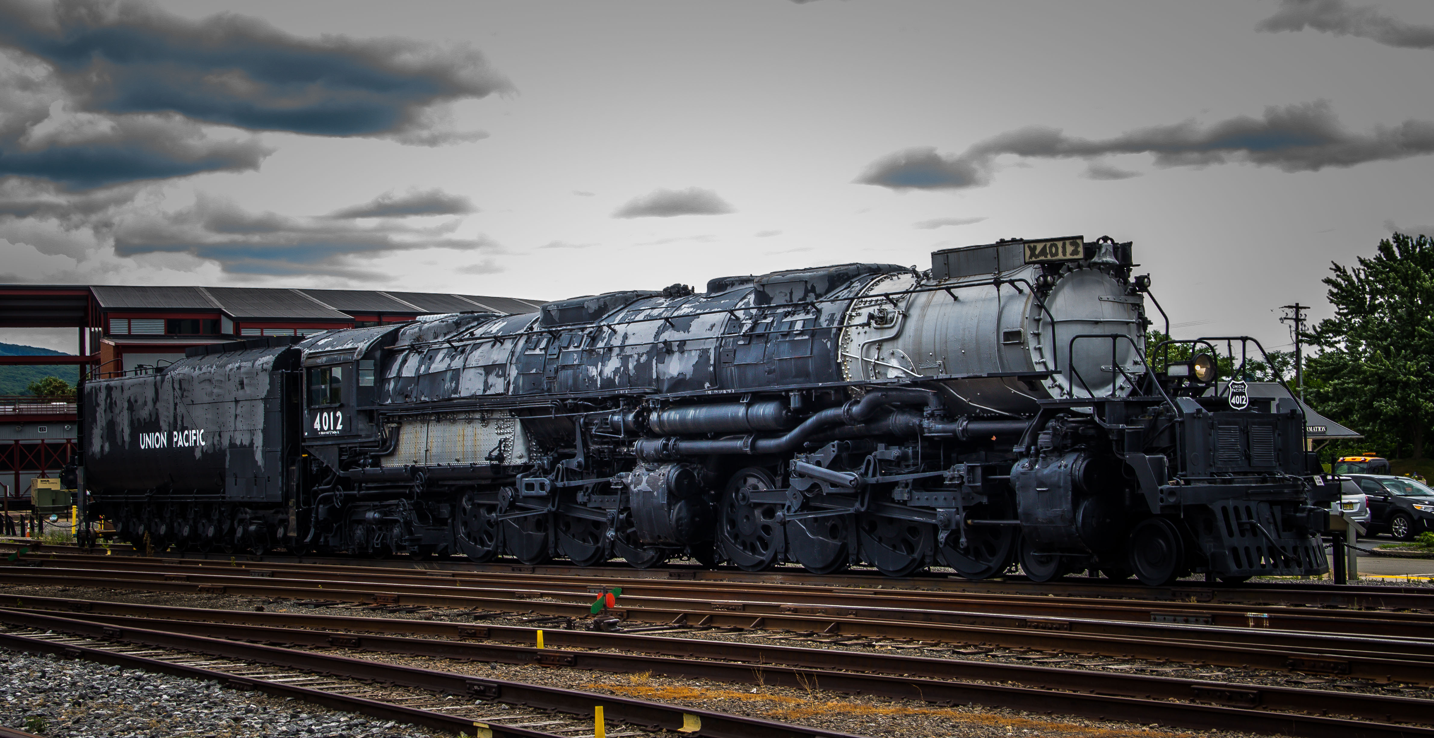 Union Pacific 4-8-8-4 #4012 is known as the Big Boy and not operational but still very impressive as the largest steam locomotive ever built. It is an articulated coal burning locomotive designed to haul heavy trains in mountains without helpers. Big Boys could speed up to 80 mph but rarely went over 60. They were the heaviest locos ever built.