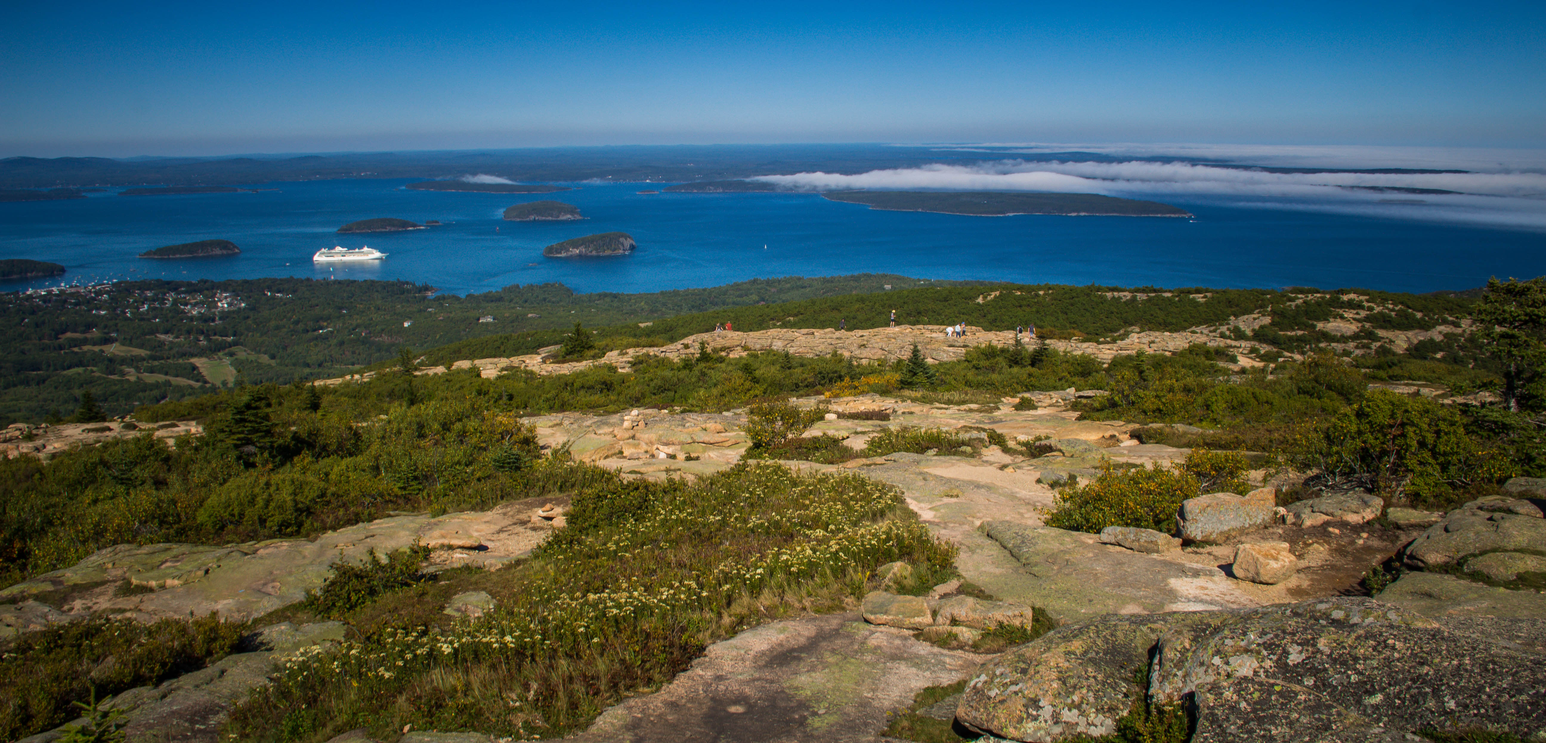 Cadillac Mountain is the highest coastal Atlantic peak north of Brazil. At 1530 feet its not what we would call real high but the views are incredible and the vegetation is almost Alpine. The road to the top is always busy so we planned to arrive late in the day, after 4PM. Turns out that was perfect, parking spaces were available and there was only one busload of tourists from the cruise ships.