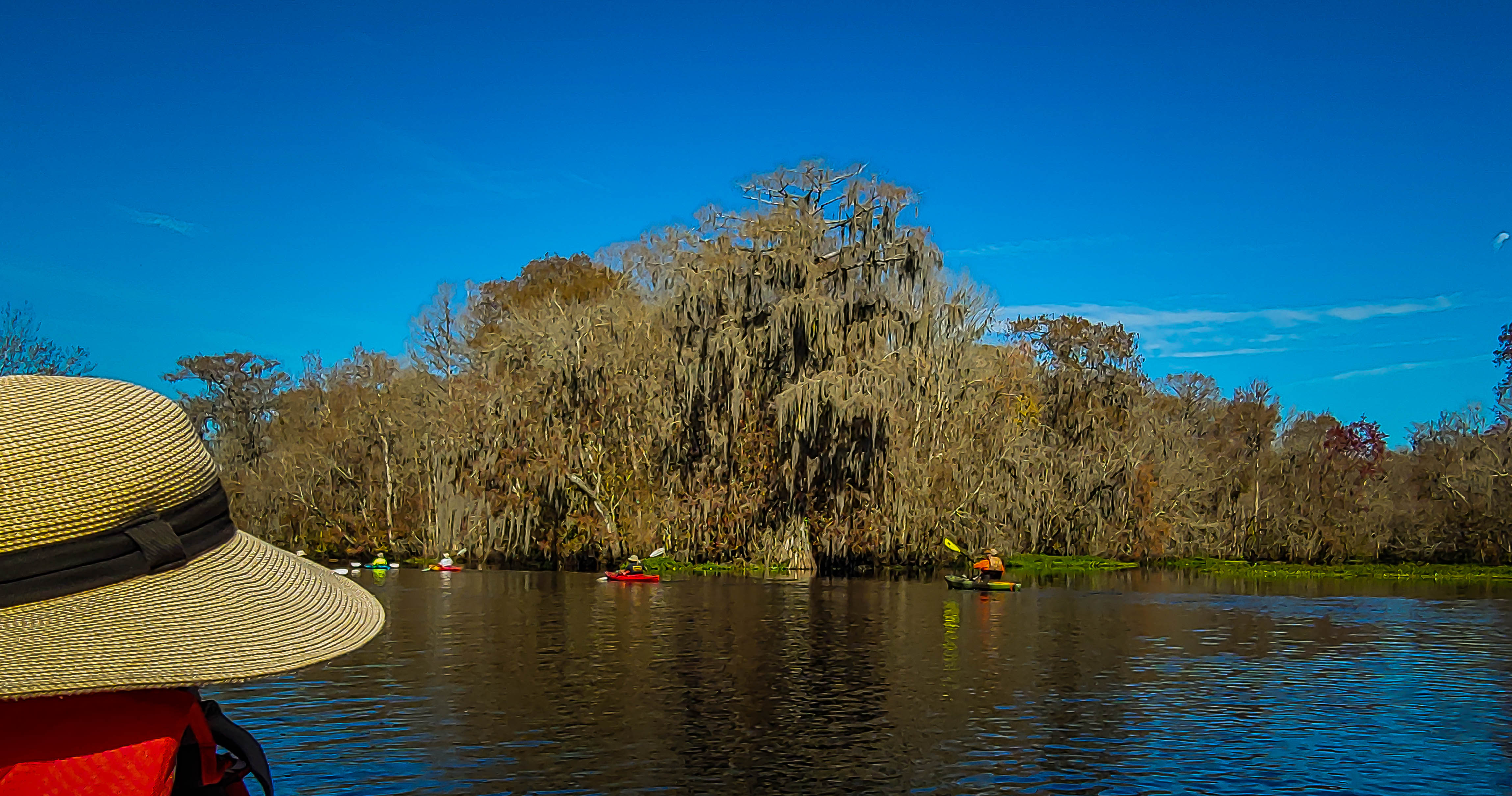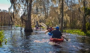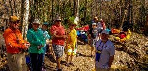Our second trip was from a put-in at the end of Turner Camp Rd near Inverness. This road dead ends deep in the wilderness at a nice ramp. From there we paddled northwest 9.3 miles with a lunch stop at a spring bubbling up right alongside the river. Crystal clear with bass and other fishes clearly visible. The entire trip was downstream so while long, was a pretty easy paddle. Again we had 13 kayaks and 15 people. This trip was A to B so we had about a 50 minute shuttle to reunite cars and kayaks. Great trip. Many thanks to the Sandy Oaks Kayak Club.
