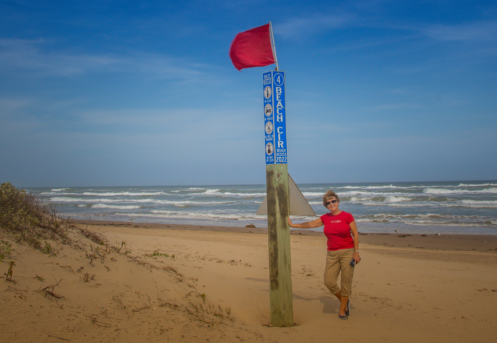 South Padre Island is a popular beach location on the Gulf of Mexico. The day we visited there was a red flag warning for high winds and a blue flag for Portuguese Man-O-War on the beach.