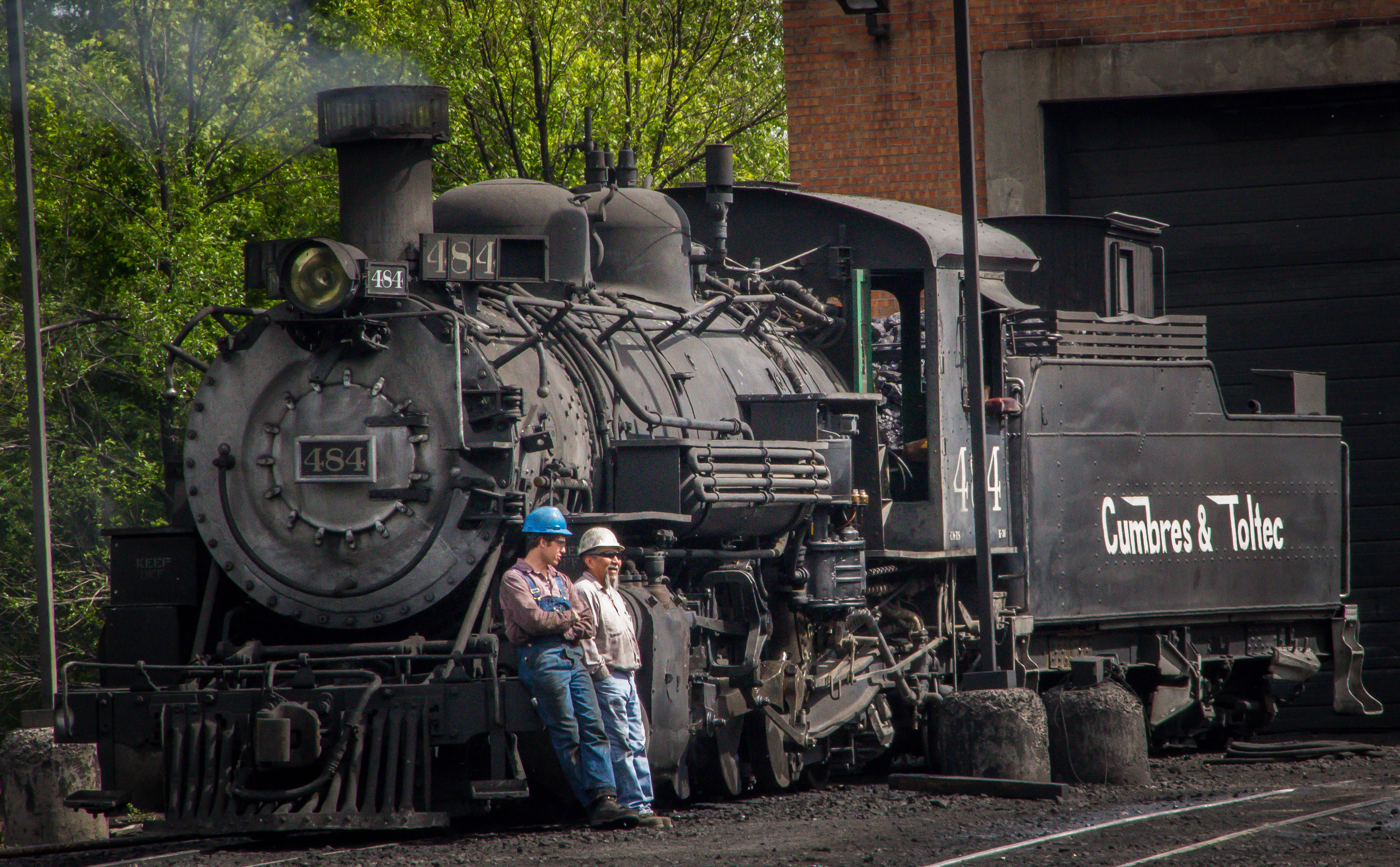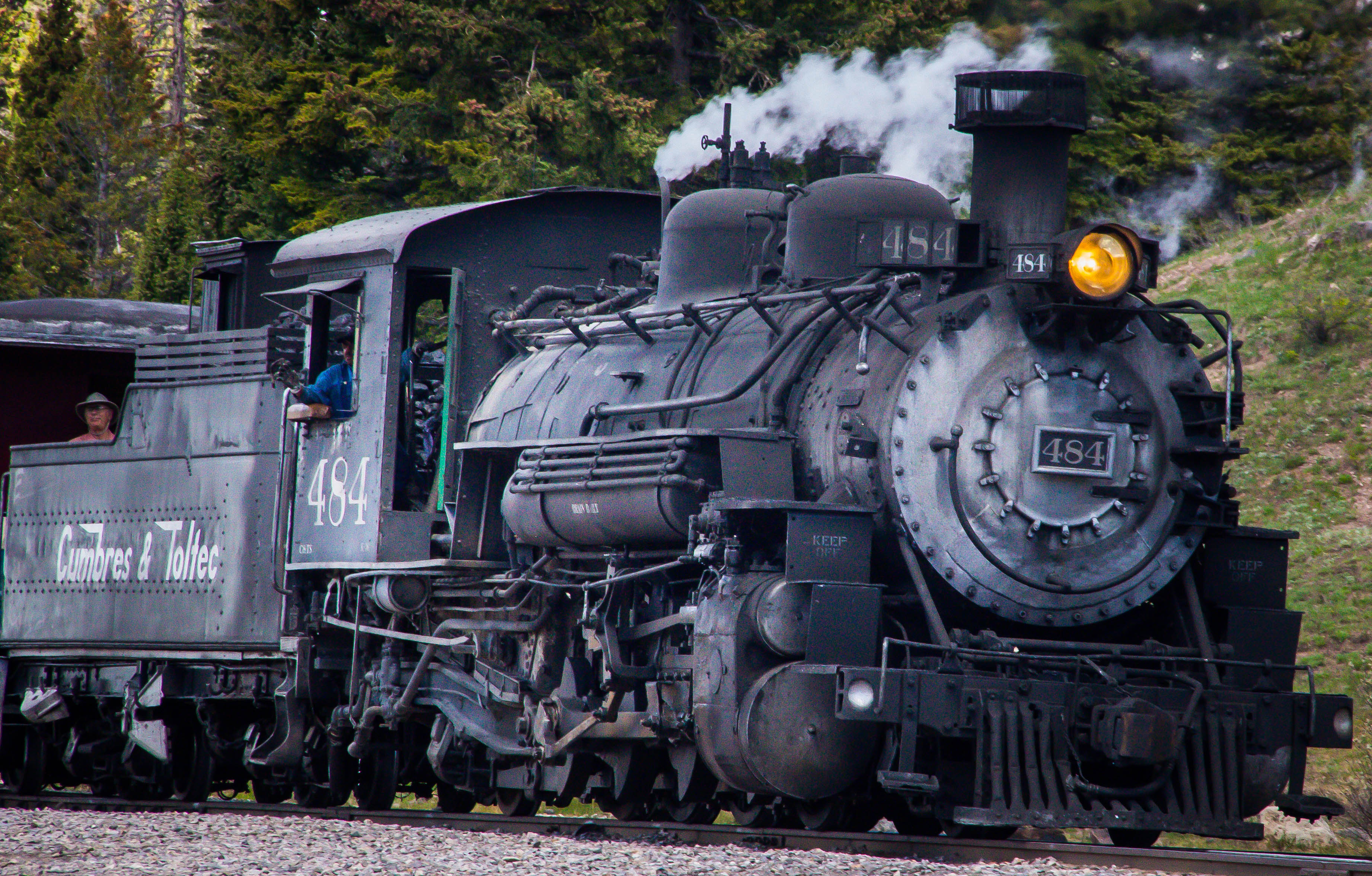 The next day we chased the train and we were lucky to find a double-header out of Chama. When one locomotive isn’t enough to haul the train up to Cumbres Pass another engine is added for that part of the trip. We found #464, nicknamed “The Mudhen” coupled with #484 providing the power that day. This is a real treat!