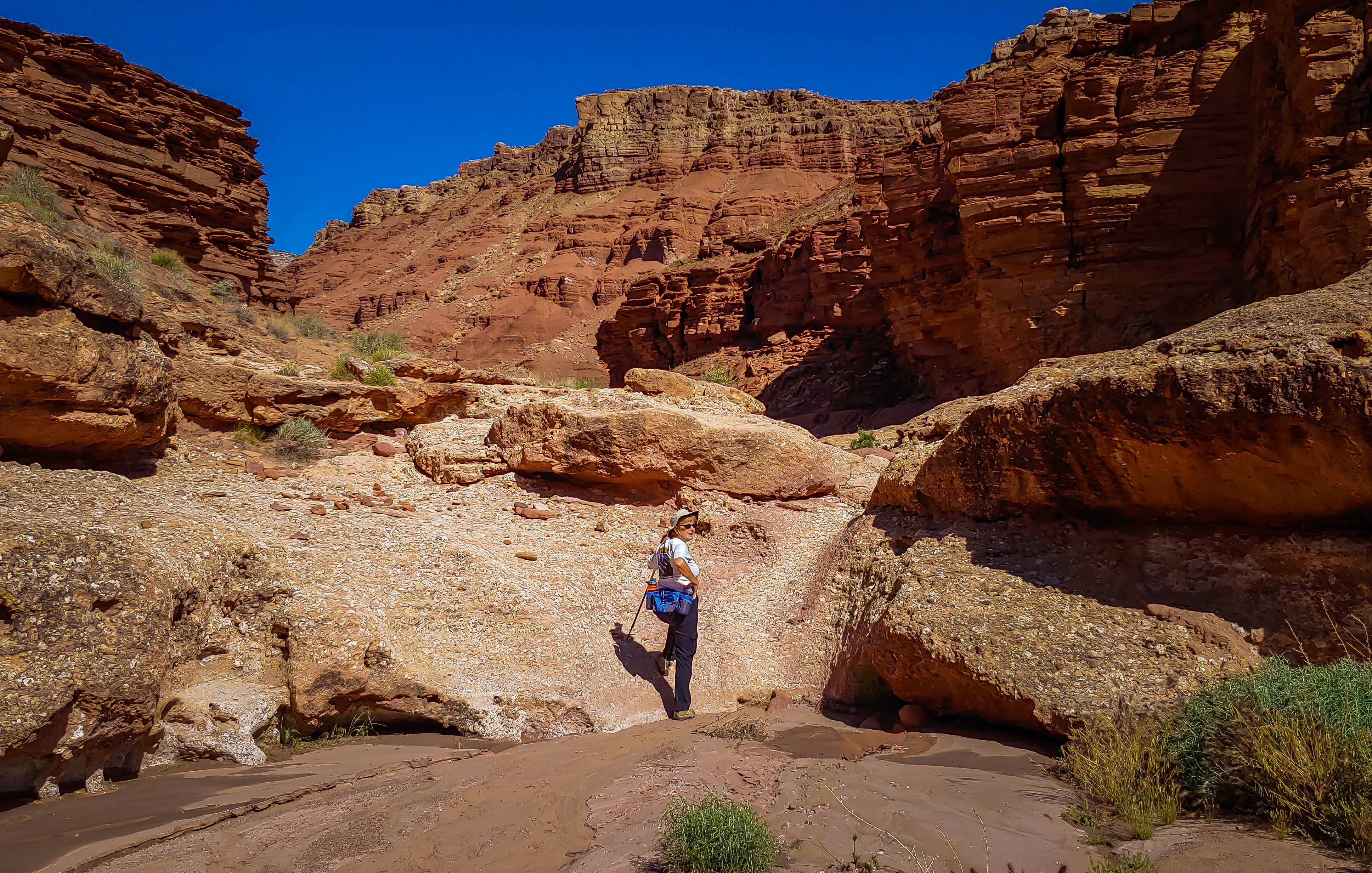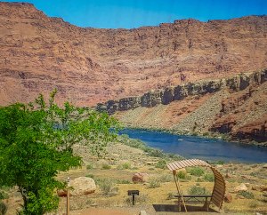 Lee’s Ferry is the only place in 700 miles of canyon country where one can drive to the Colorado River. This made it a prominent location in the history of northeastern Arizona. Today it can be reached from Page AZ or the North Rim of the Grand Canyon or from Flagstaff off US 89. Lee’s Ferry Campground is part of Glen Canyon National Recreation Area and one of the most beautiful campgrounds we have ever visited. Our photos really don’t do it justice. It is surrounded on 3 sides by the Colorado River and beautiful red cliffs. We hiked a scenic trail up a dry wash before visiting the riverside to see boats launching and historic ruins.