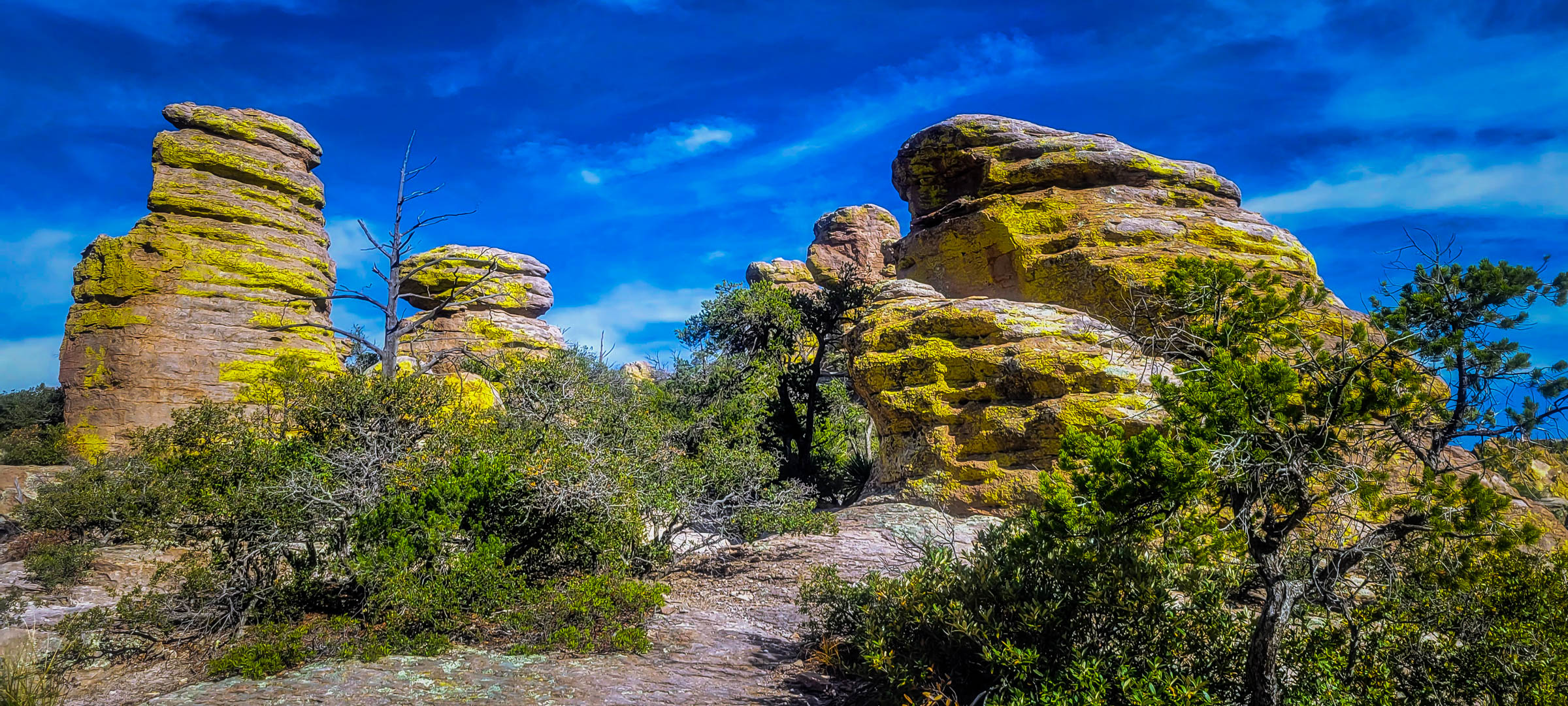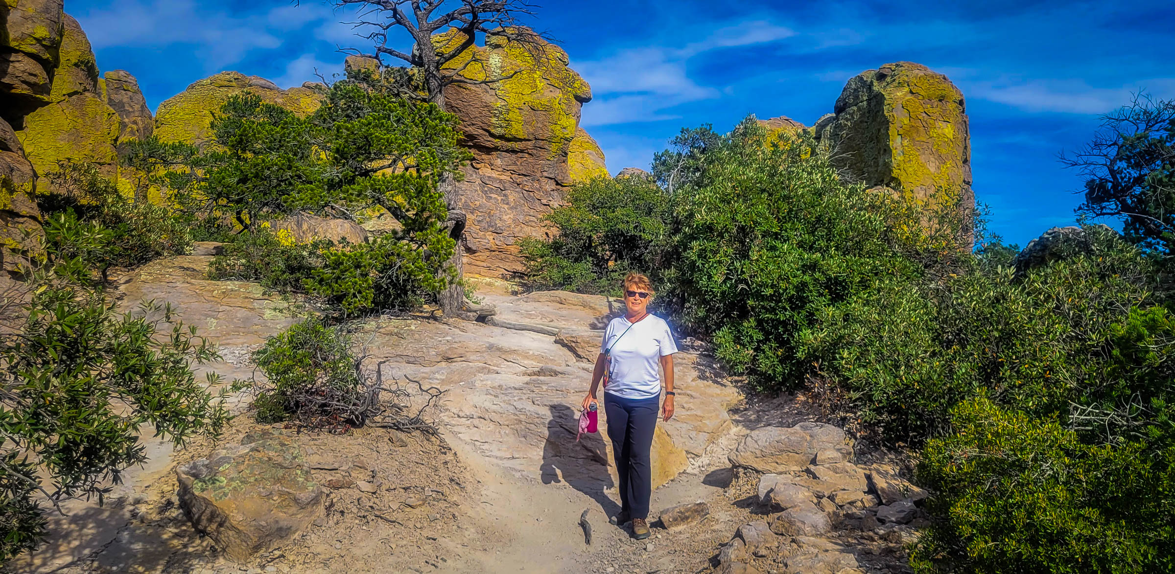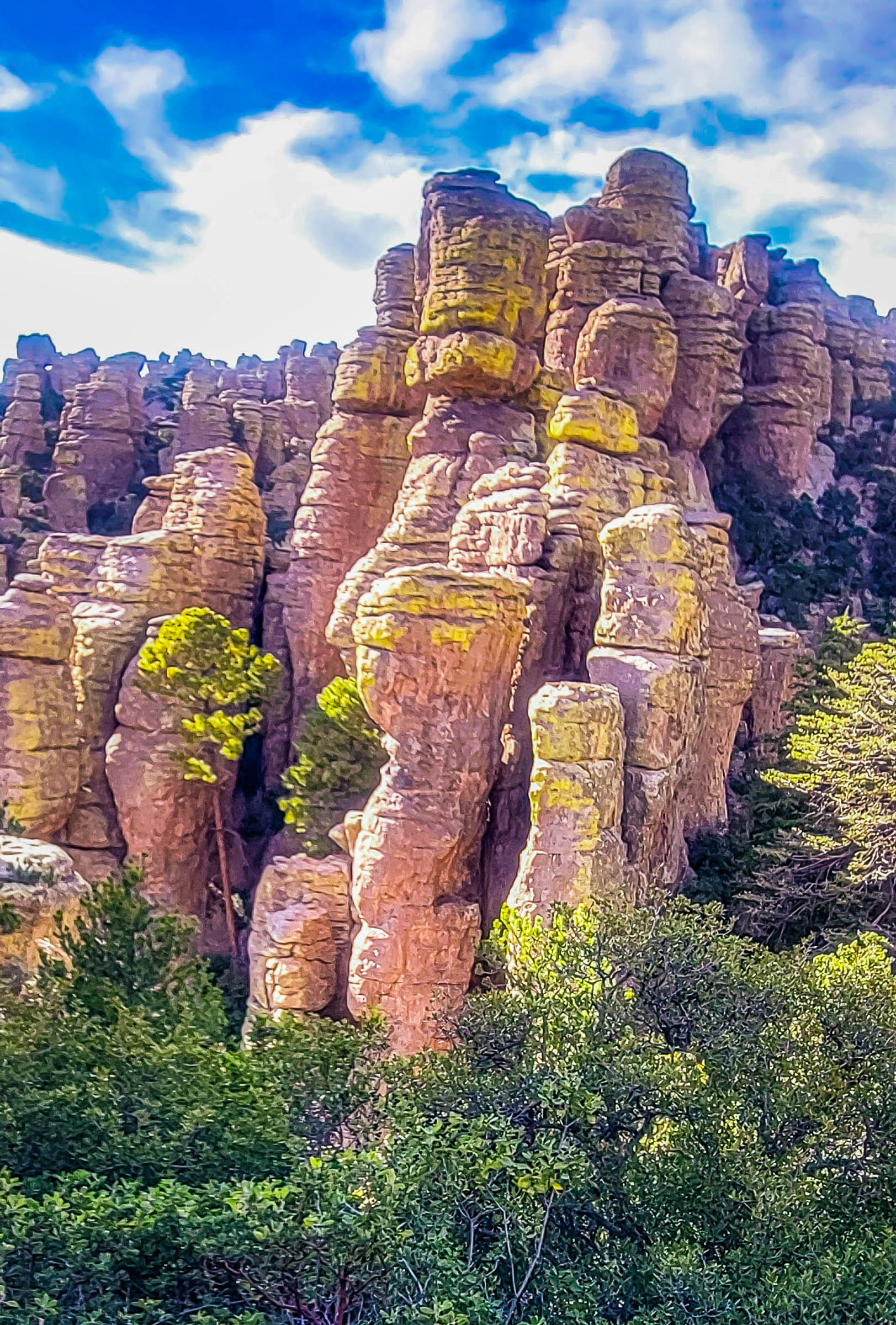 One of our absolute favorite national parks is Chiricahua National Monument in southeast Arizona. We remember the smell of the forest the first time we visited. The park is located about an hour from the RV parks in Benson. Its an easy day trip but we hope to camp at the park campground one day. The Chiricahua Mountains rise up to 9,273 feet with plants and animals from 4 ecosystems meeting in this range. There are species from the Rocky Mountains, the Sonoran Desert, the Chihuahuan Desert and even the Sierra Madre Mountains of Mexico.. This area was home to the Chiricahua Apache since the1400s. They called the rock pinnacles “standing up rocks”.