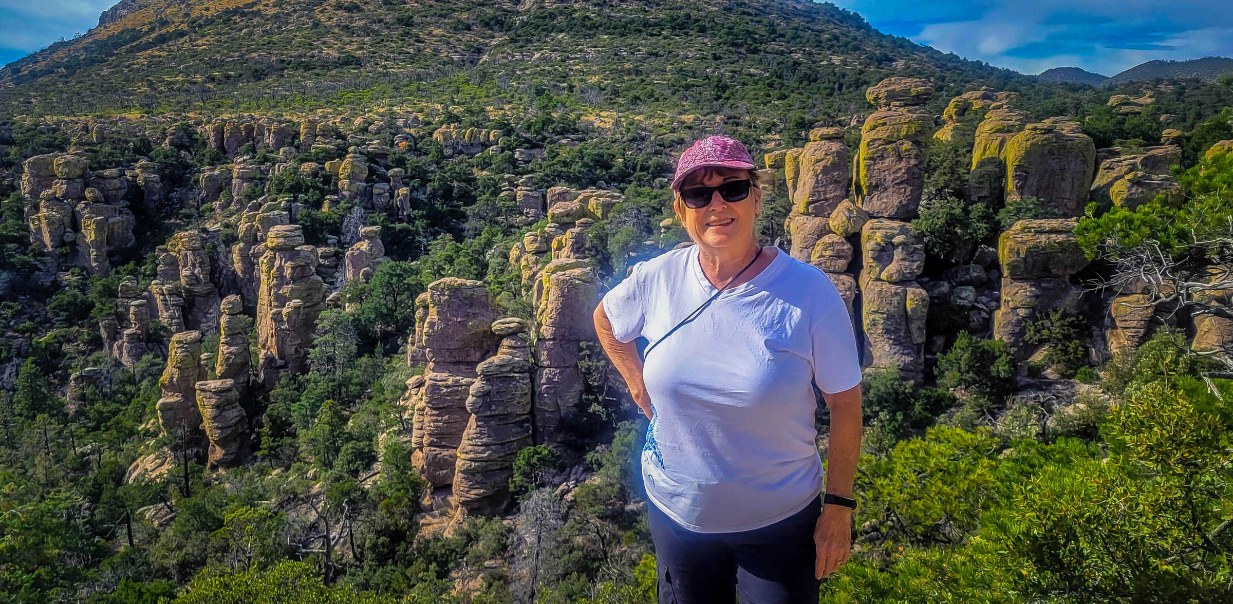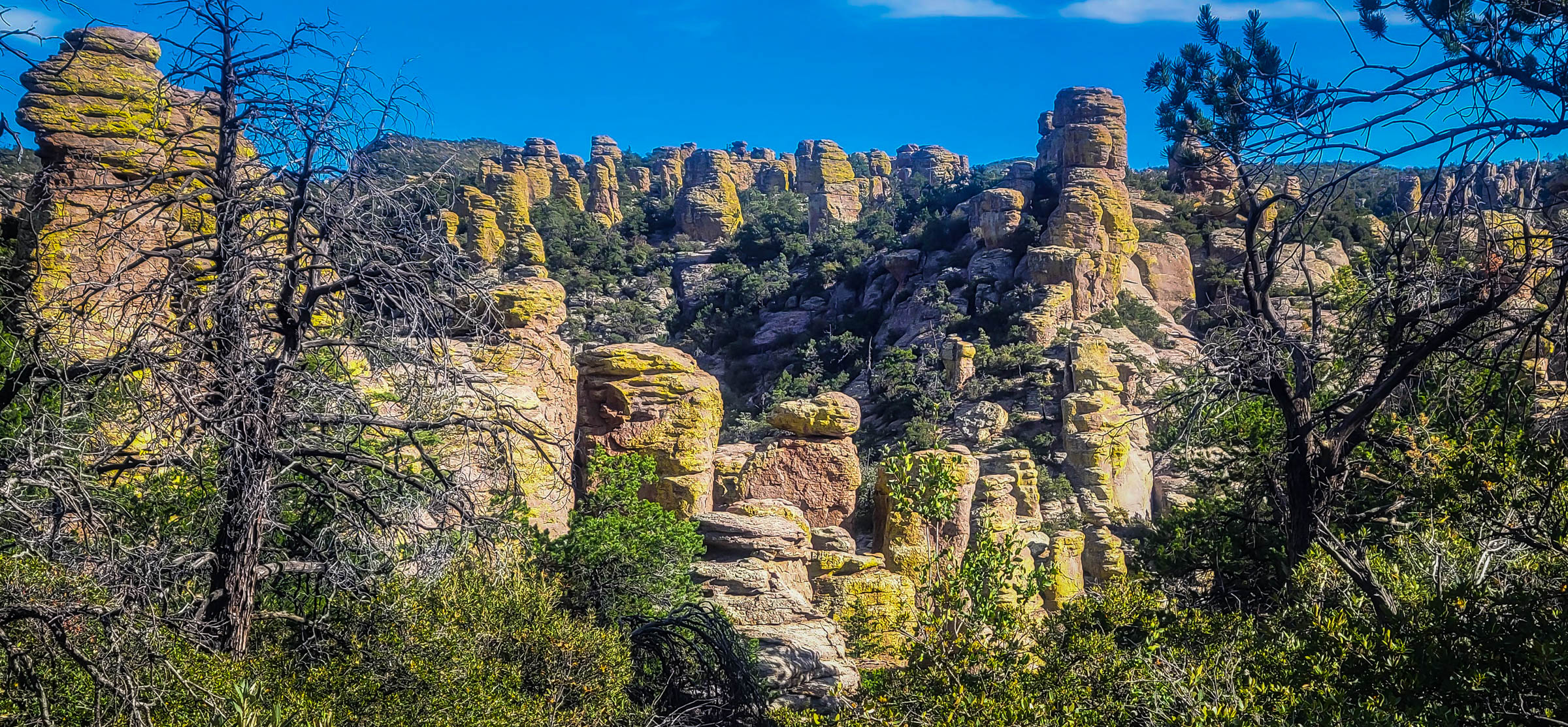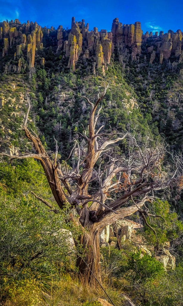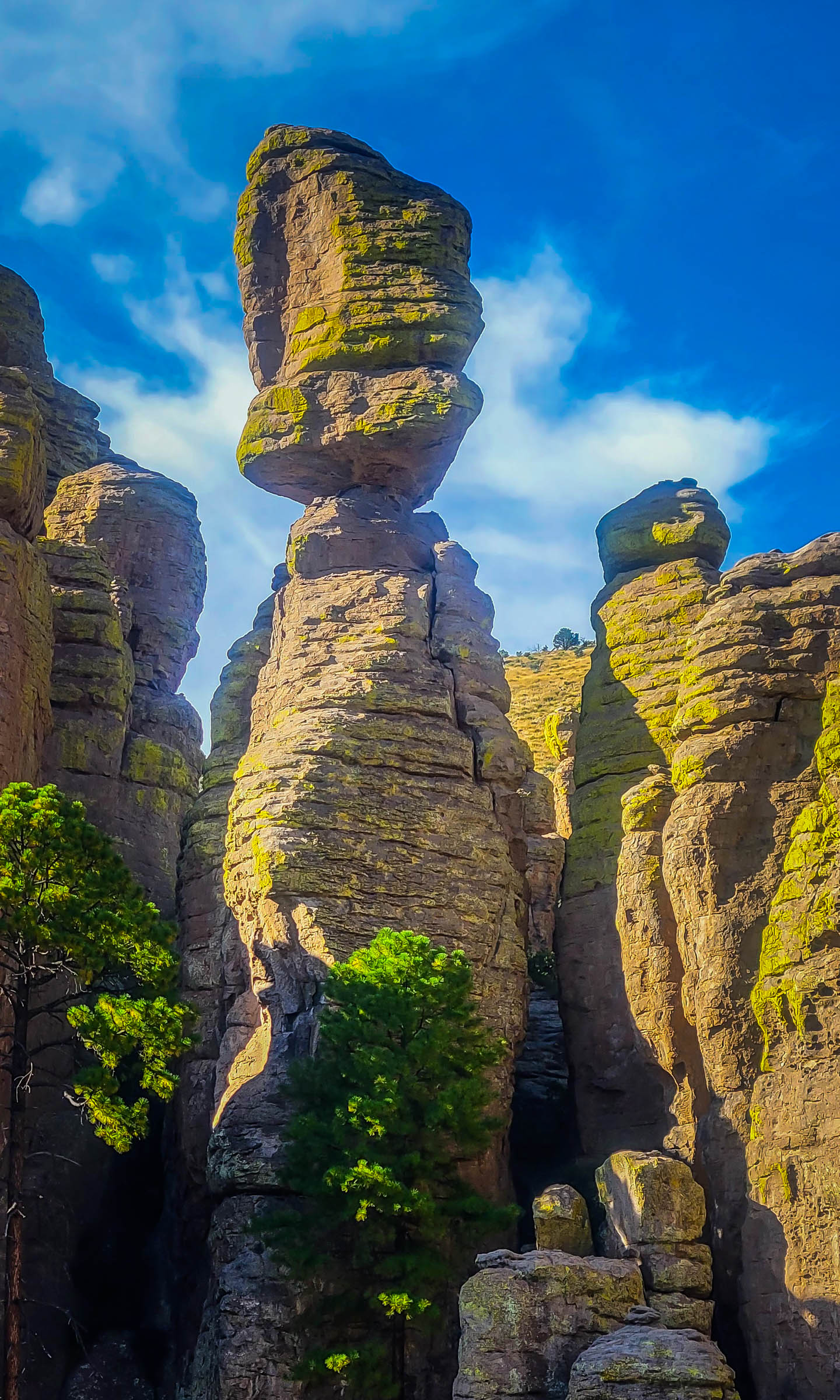 One of our absolute favorite national parks is Chiricahua National Monument in southeast Arizona. We remember the smell of the forest the first time we visited. The park is located about an hour from the RV parks in Benson. Its an easy day trip but we hope to camp at the park campground one day. The Chiricahua Mountains rise up to 9,273 feet with plants and animals from 4 ecosystems meeting in this range. There are species from the Rocky Mountains, the Sonoran Desert, the Chihuahuan Desert and even the Sierra Madre Mountains of Mexico.. This area was home to the Chiricahua Apache since the1400s. They called the rock pinnacles “standing up rocks”.