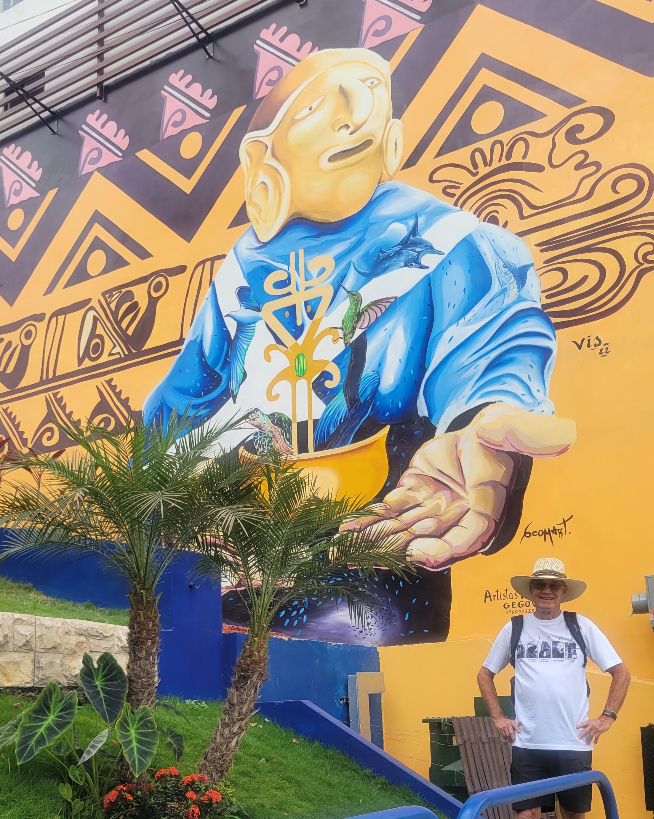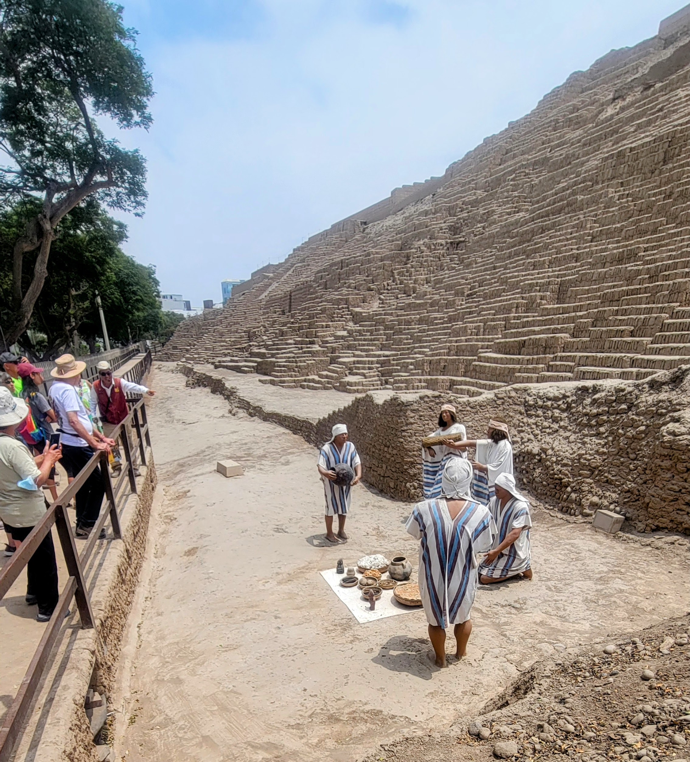 Callao (Lima) Peru. At the time of our visit Peru was experiencing political turmoil and there was a possibility we would not be able to dock in Callao, Lima’s port city. We docked without incident for 3 days and 2 nights which allowed some guests to take overnight excursions to the Galapagos Islands and Machu Picchu. A local craft market setup on the pier and we found beautiful Alpaca yarn and sweaters as well as jewelry and other gifts. Our travel agent Cruise Specialists provided a complimentary tour of Lima Then and Now. The first stop in the center of old Lima was Casa Solariega de Aliaga Lima’s oldest house. The original owner was one of the early conquistadors from Spain and the home has been in the same family since. After a walking tour where we saw the Presidential Palace, City Hall and Cathedral we traveled to a 60 year old mansion Casa Luna in the exclusive San Isidro neighborhood. The home while still lived in had museum quality collections of nativity scenes from all over Peru and the world. They served Pisco Punch a local favorite alcoholic beverage. There was heightened security but no disturbances while we were in Lima. Since the port of Callao is an area of poverty and street crime the cruise line offered a free shuttle bus to a good area to tour. Here we visited Miraflores, an upscale suburb with many craft markets and the 2000 year old site of Huaca Pucclana. We had a great tour of this amazing archeological site built 14 civilizations before the Inca. It is a very large pyramid structure built of vertical adobe bricks. One reason the site is so well preserved is that Peru is a very dry place. We learned it had not rained in Lime since 1972! There is plenty of water though due to rivers from the Andes. Afterwards we enjoyed a lunch of Peruvian cuisine at the adjacent restaurant. The craft vendors on the pier had great deals on Alpaca yarn and sweaters. Our cruise continued to General San Martin which is a port city near Paracas and Pisco Peru. We had hoped to visit the Tambo Colorado archeological site but it was closed for restorative work. This is also the area of the mysterious Nazca Lines and we good a good look at the Paracas Candleabra from the ship. This geoglyph was carved 2 feet into the hillside, stands 600 feet tall and has been dated to 200 BC. The meaning and purpose of the site remain a mystery.