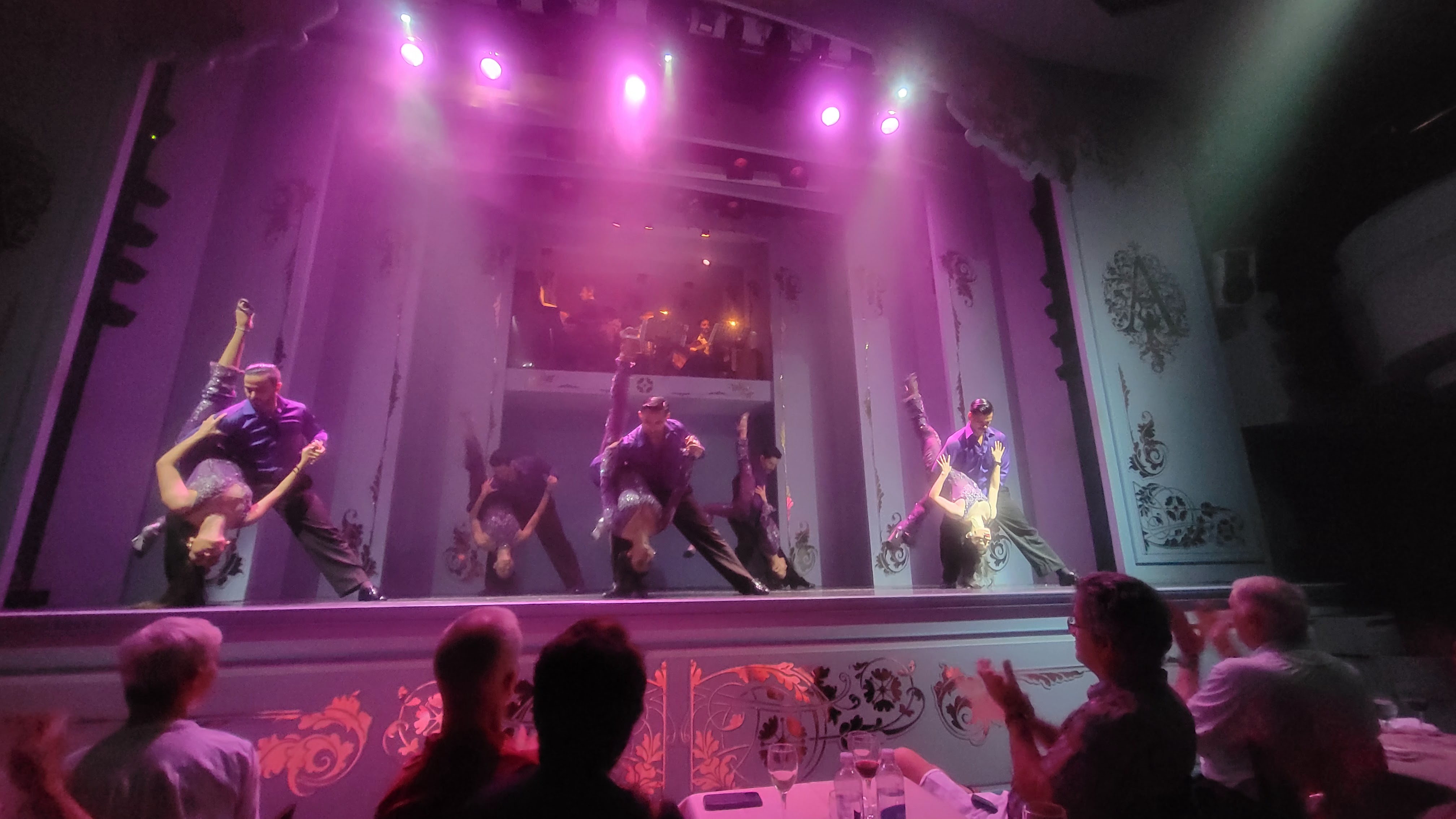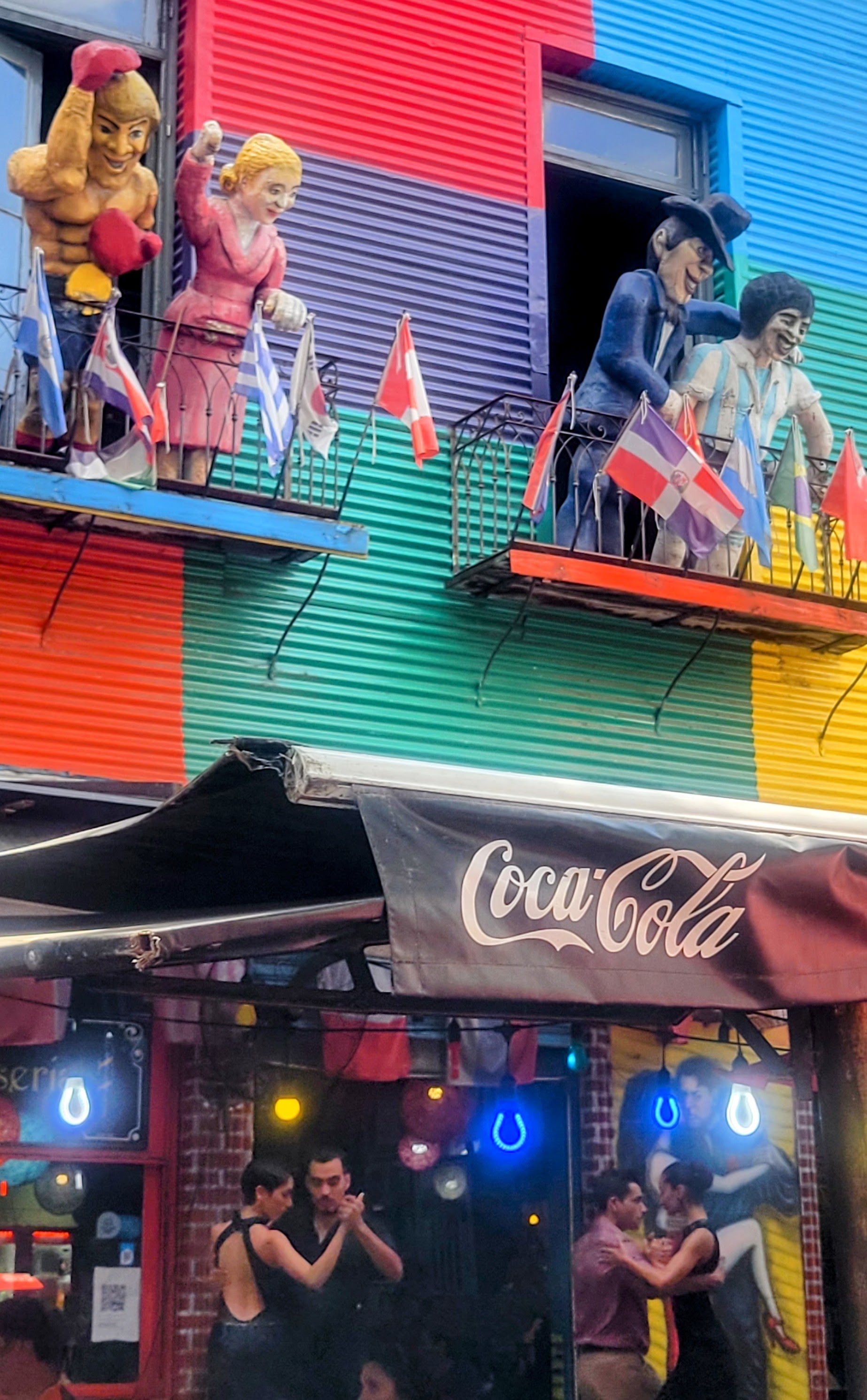 Buenos Aires Argentina. Buenos Aires was the end of the cruise for many and the beginning for some just joining us. It is a huge city of over 15 million. Again since the port area was not the best, HAL offered a shuttle to the center of the city. We saw churches, monuments, the clock tower, a railroad museum and a shopping mall with great frescoes on curved ceilings. A HAL tour showed us Recoleta Cemetery where Eva Peron is buried and the El Ateneo bookstore/cafe built in a former opera house. As we were staying overnight we were able to attend a tango show at one of BAs tango cafes. It was spectacular with 10 dancers 2 singers and a live band. The next day we took a hop on hop off bus tour where we saw different neighborhoods. La Boca neighborhood was especially lively with colorful shops, restaurants, impromptu tango dancers and 3 dimensional street art.