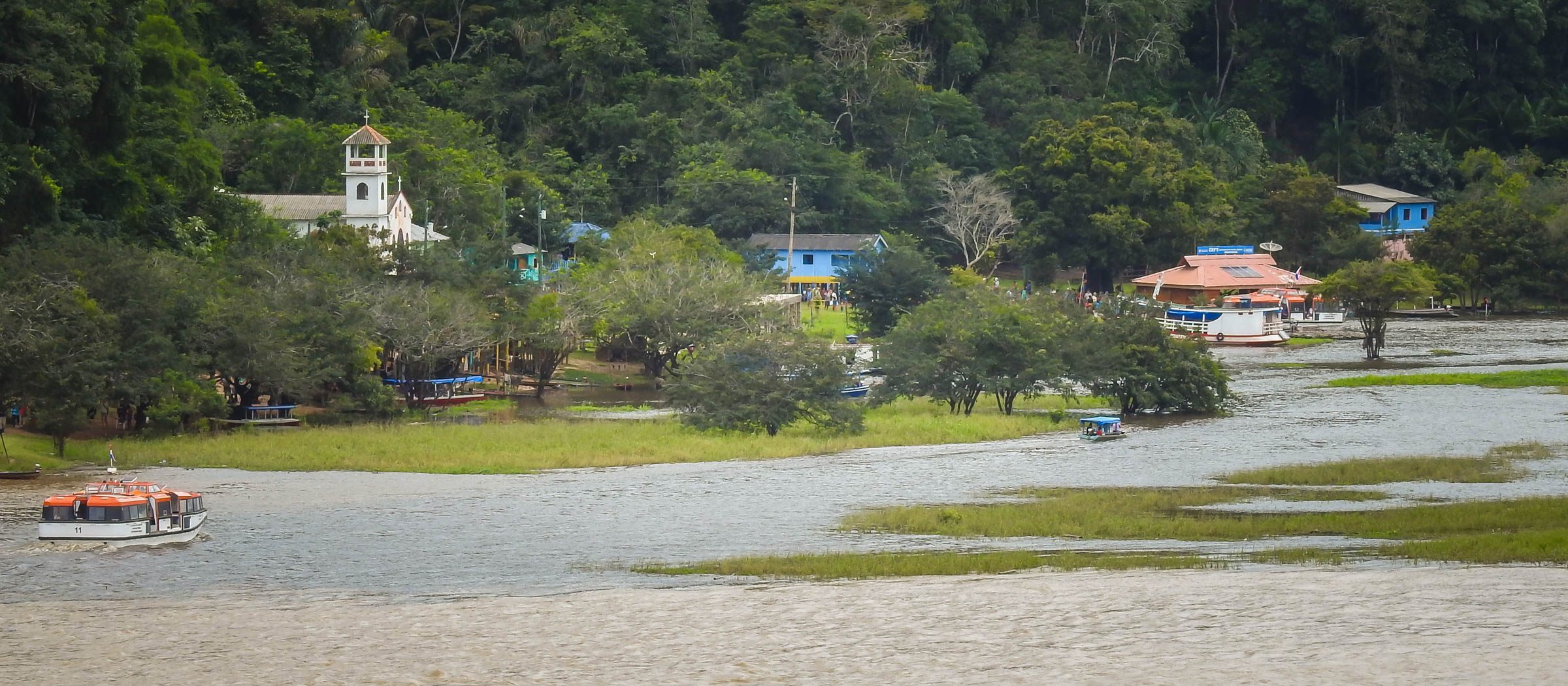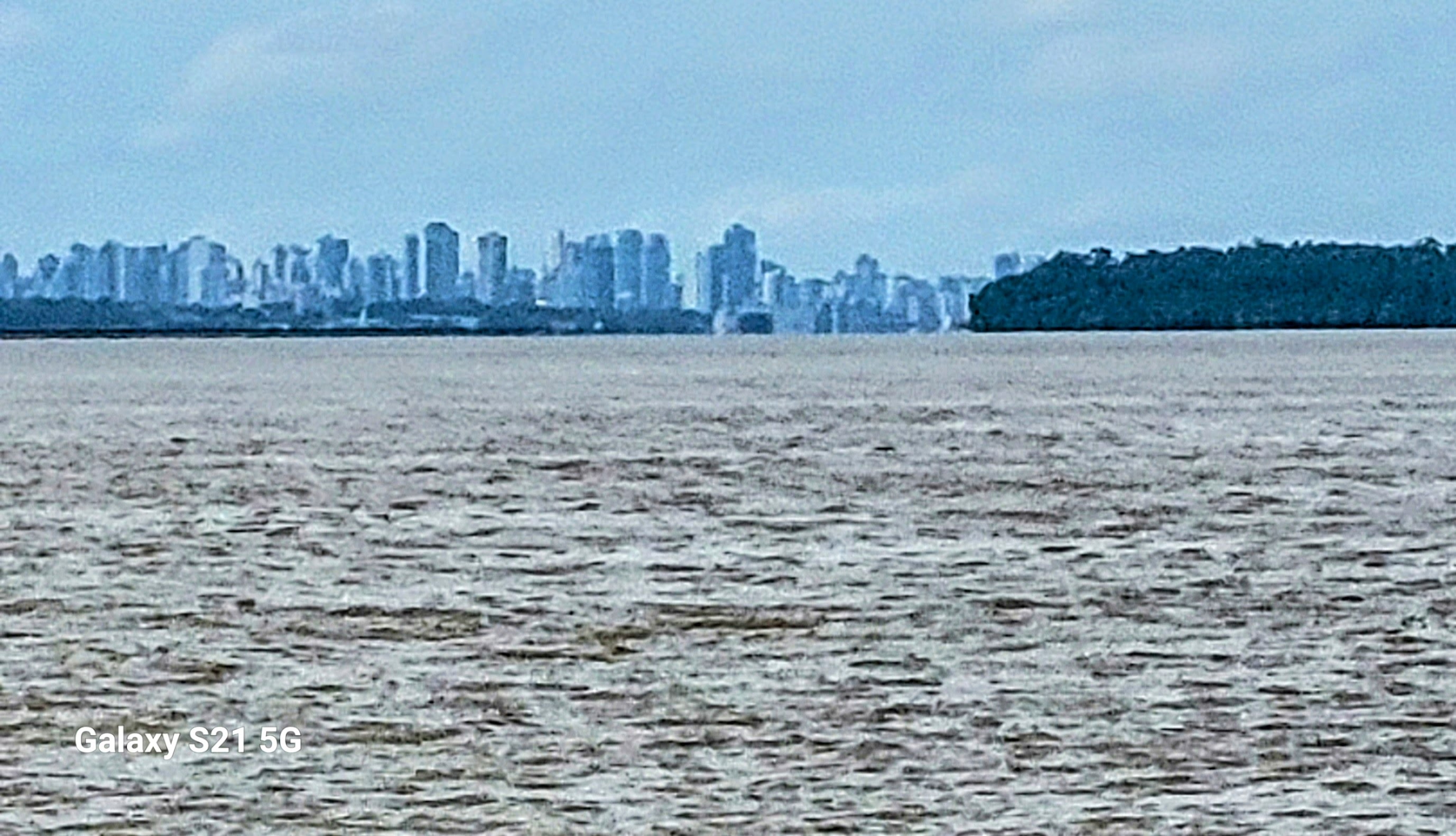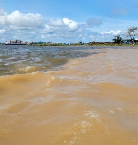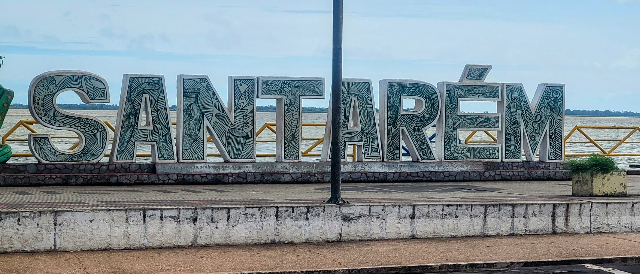 Santarem Brazil Santarem is a city right on the Amazon. Here we joined 6 others for a small boat tour of the area. We saw villages built on stilts, pink dolphins, giant water lilies and the meeting of the waters where the Amazon and its tributary flow side by side without mixing for miles. We fished for Piranha (didn’t catch any). It was great fun.