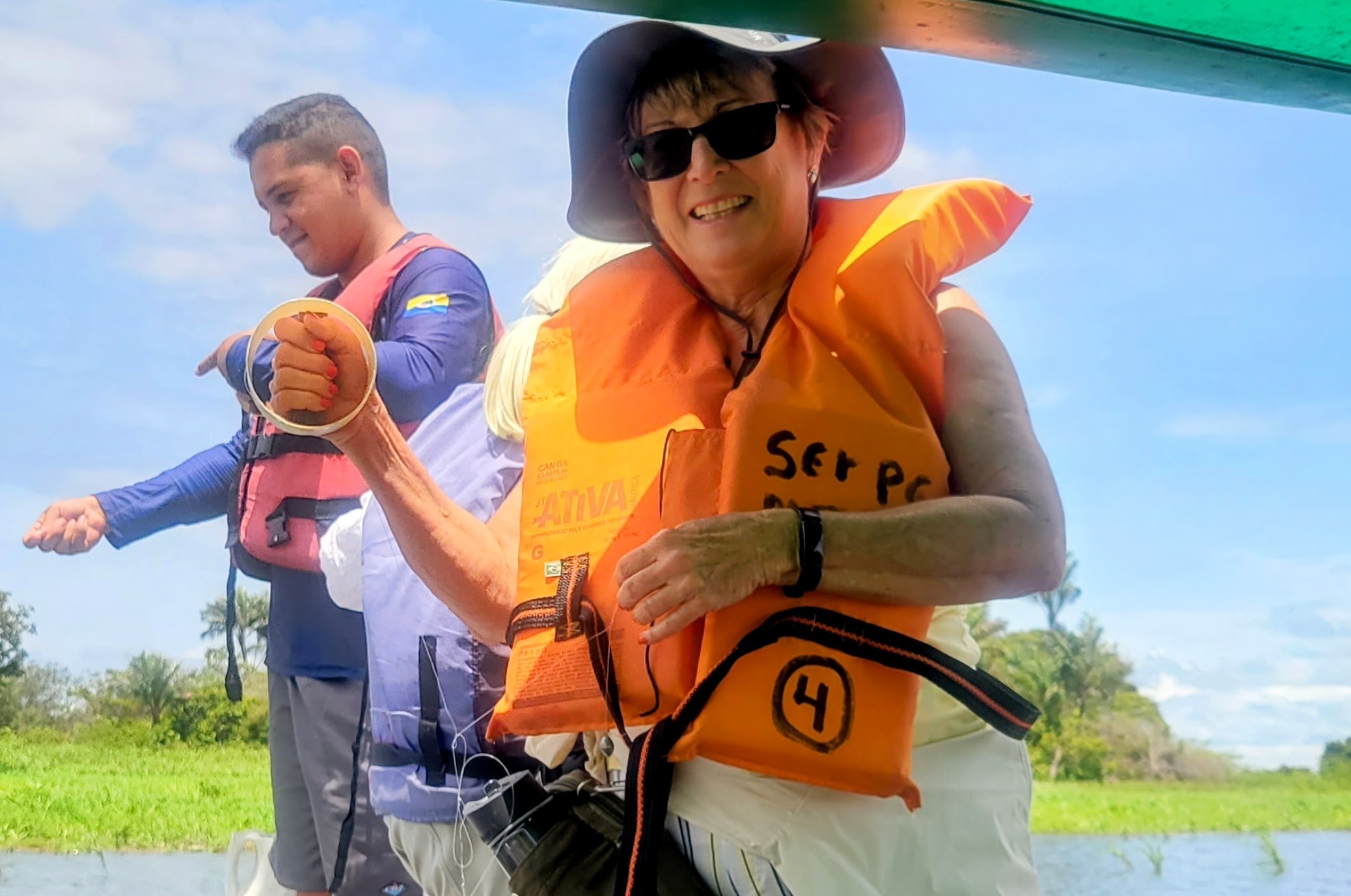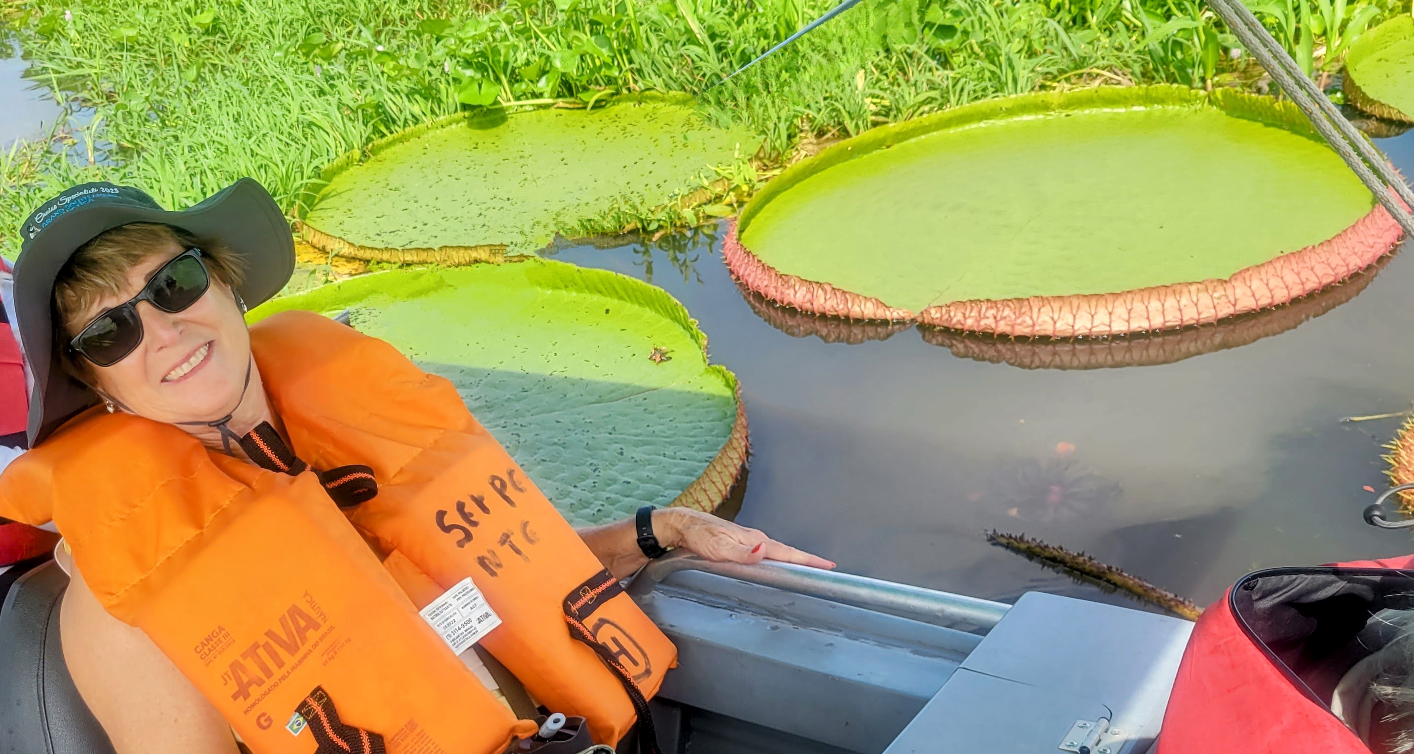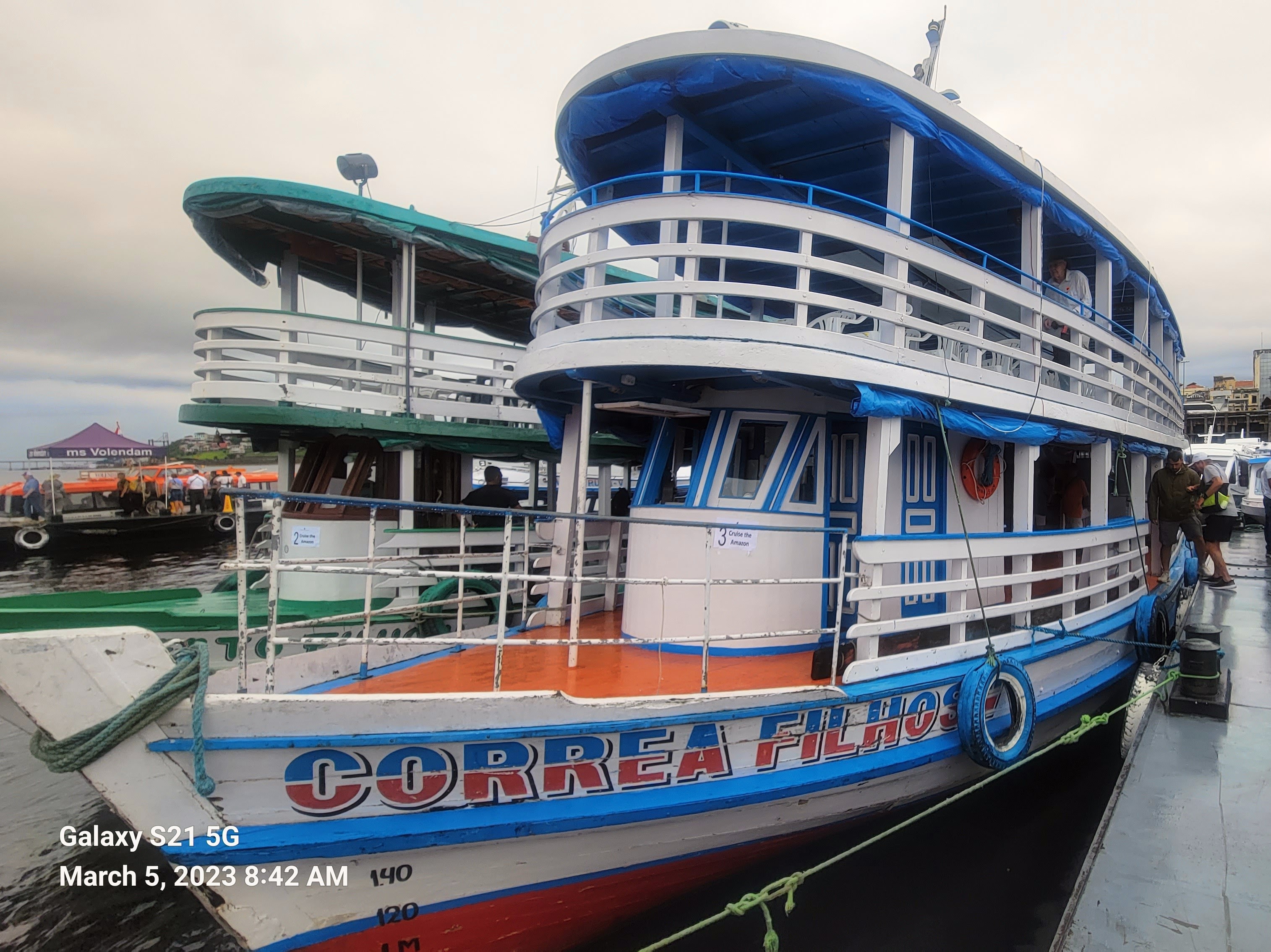 Santarem Brazil Santarem is a city right on the Amazon. Here we joined 6 others for a small boat tour of the area. We saw villages built on stilts, pink dolphins, giant water lilies and the meeting of the waters where the Amazon and its tributary flow side by side without mixing for miles. We fished for Piranha (didn’t catch any). It was great fun.